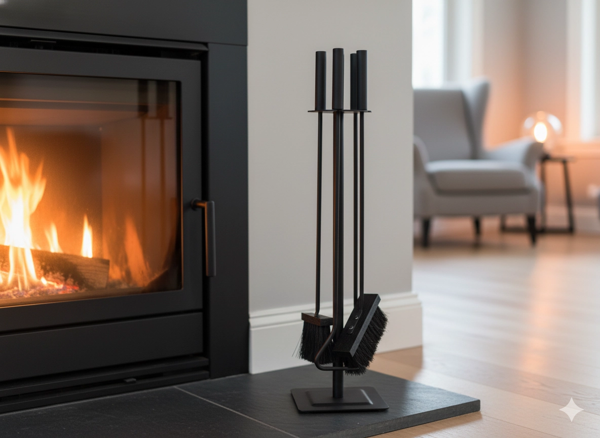 - Komplet udstyr til betjening af pejsen: skovl, kost og ildrager.