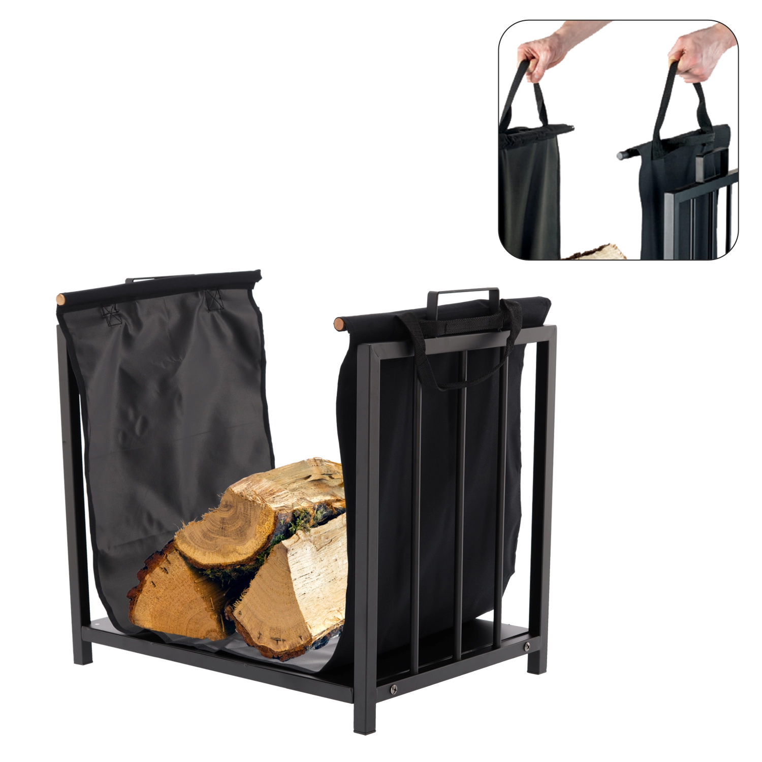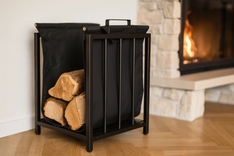 Tekstilindsatsen med håndtag gør det nemt at bære brændet fra udendørs til indendørs og holder området omkring pejsen fri for splinter og støv.