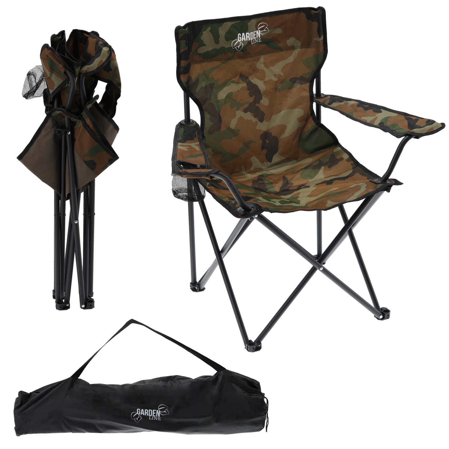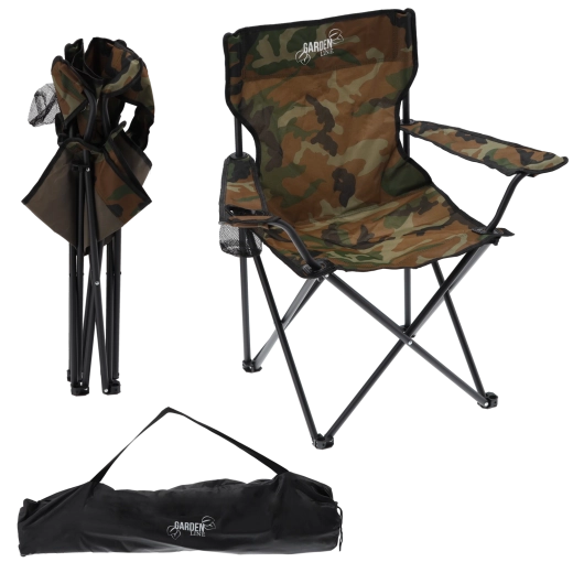Nyd komforten i naturen med den sammenklappelige turiststol i camouflage-design. Den robuste stålramme sørger for stabilitet, det slidstærke Oxford 600D-stof for lang levetid, og den integrerede kopholder holder flaske eller bæger lige ved hånden.