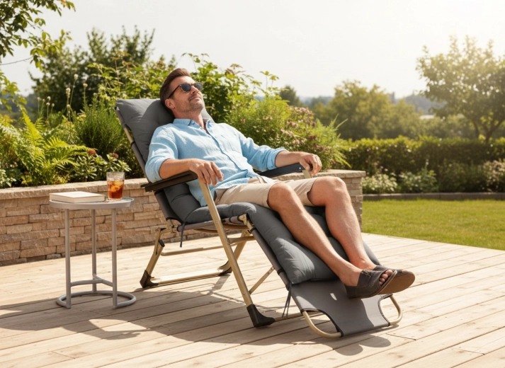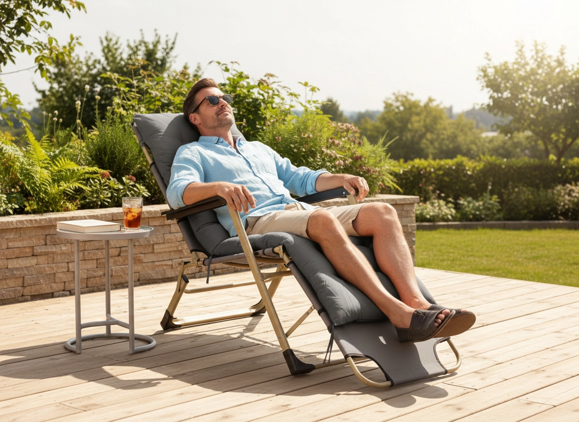 Kan nemt klappes sammen og giver mulighed for at indstille positionen fra siddende til næsten helt liggende – ideelt til læsning og lur.