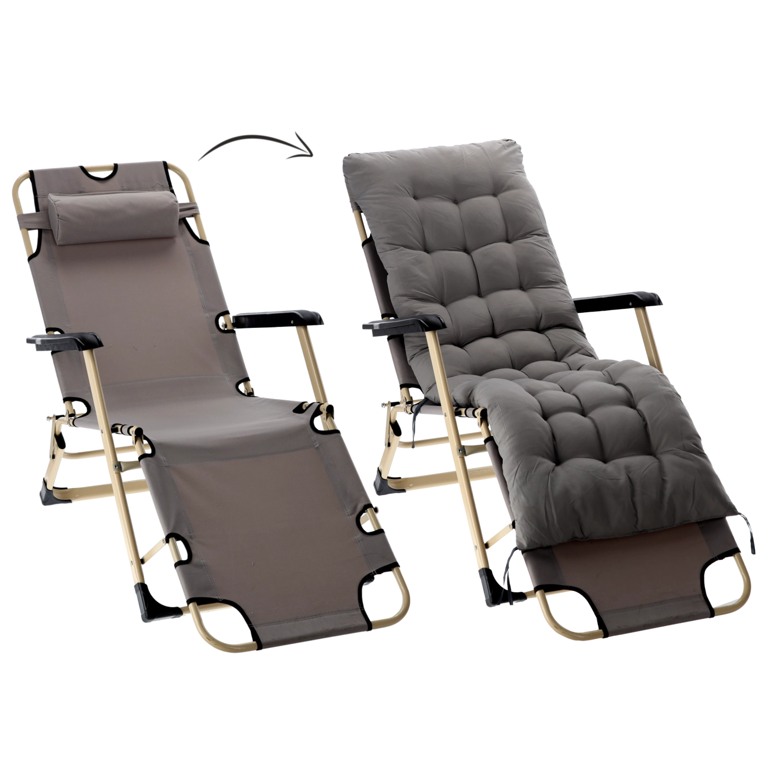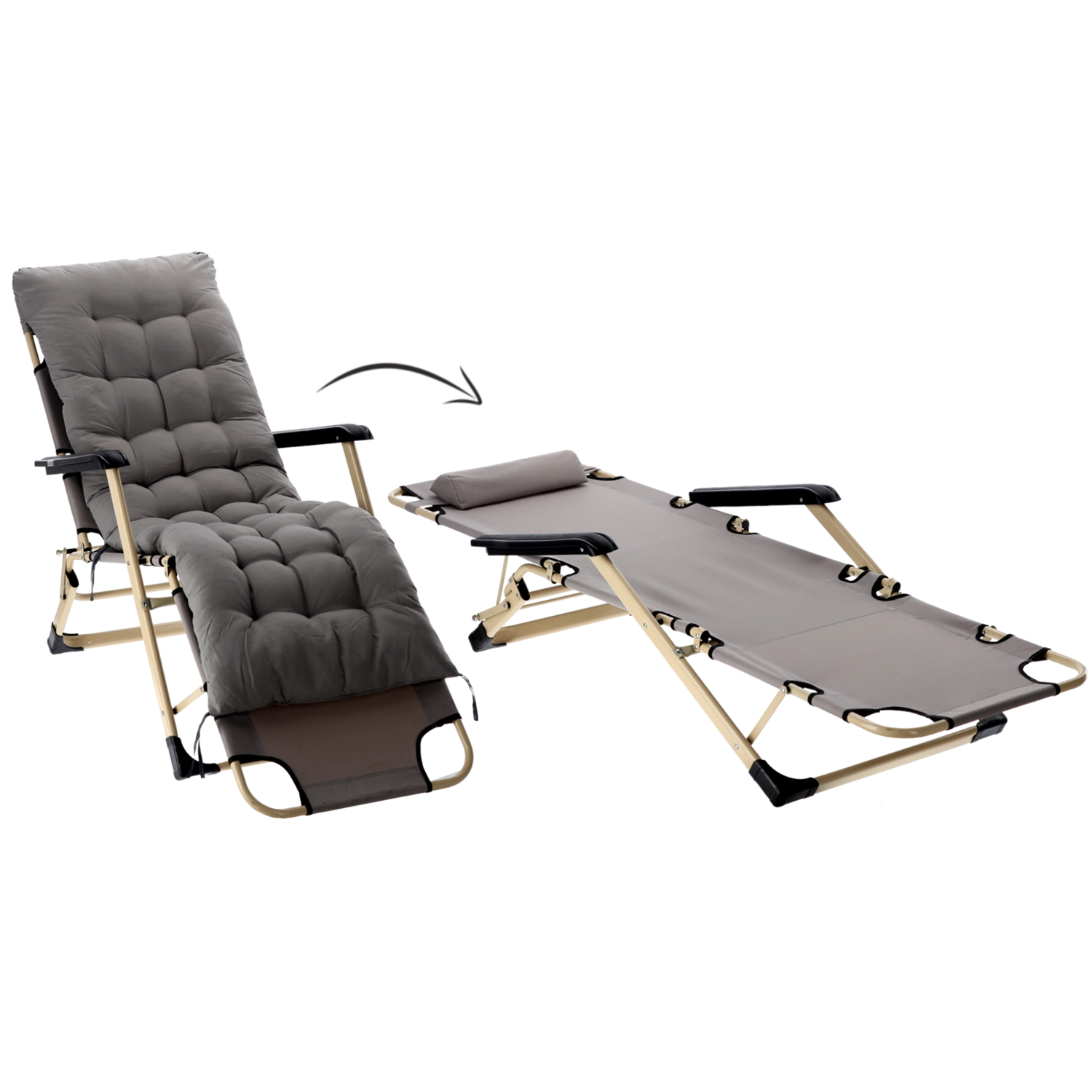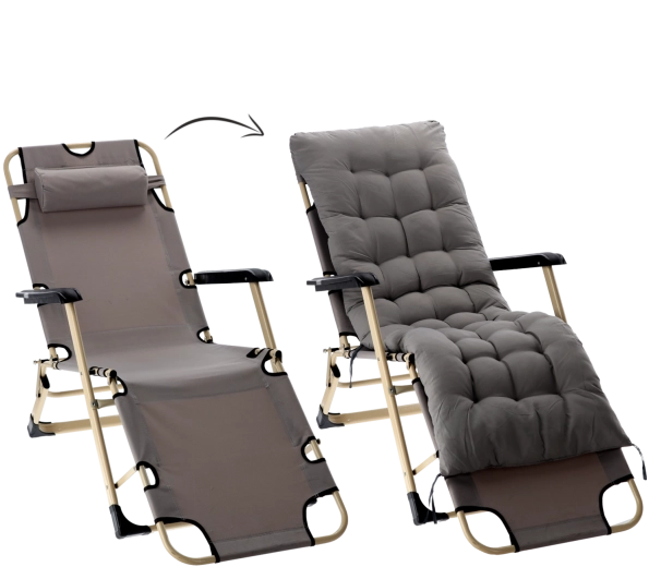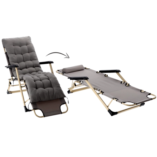 Den praktiske 2-i-1 liggestol/stol kombinerer en stabil stålramme med slidstærkt Oxford-stof 600D x 300D og en kraftig, quiltet polstring. Den kan foldes sammen på et minut og tages med – ideel til haven, terrassen, ved poolen og på farten.