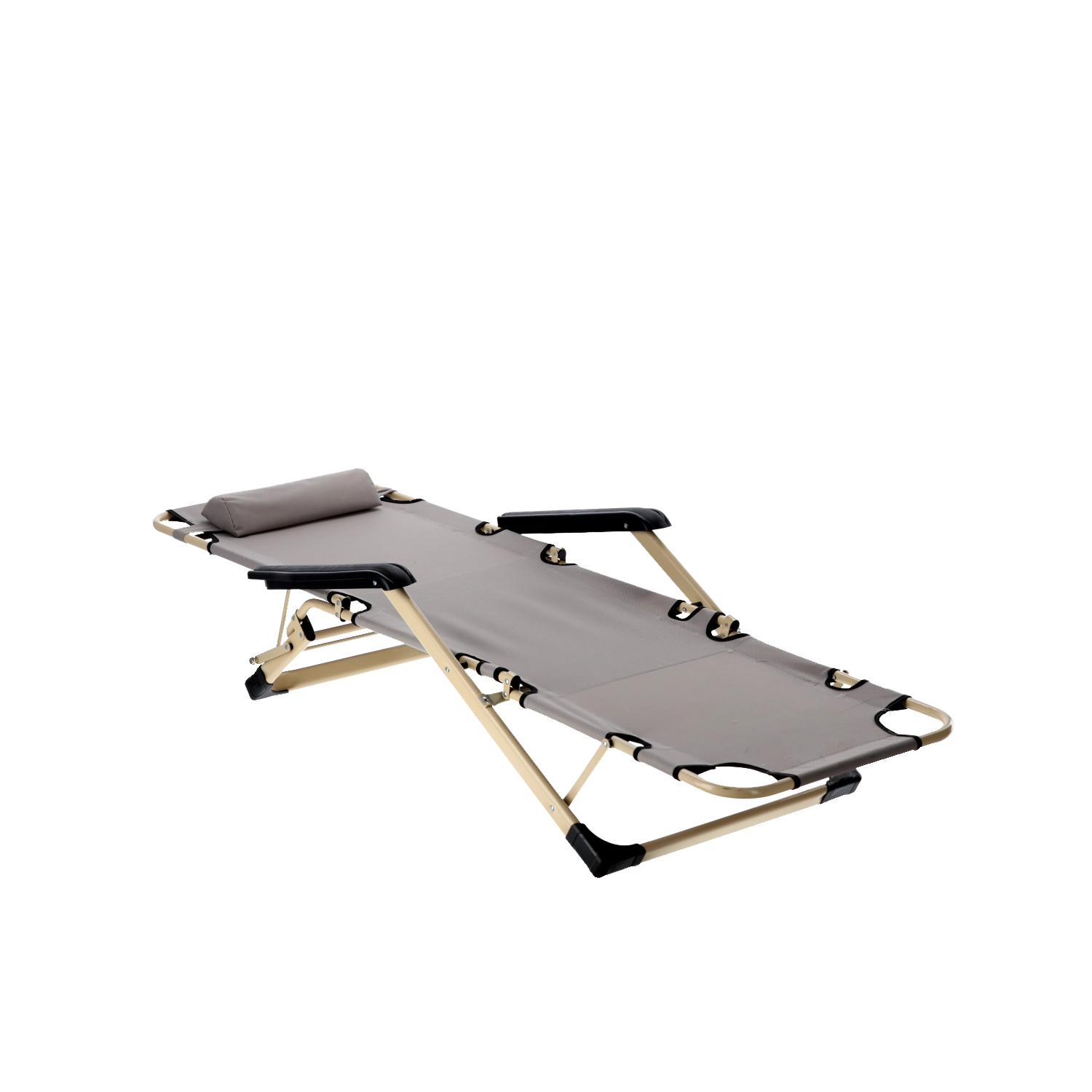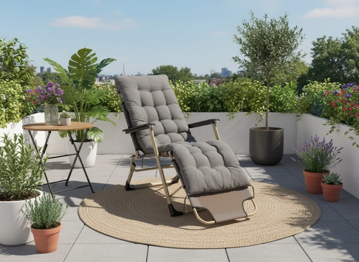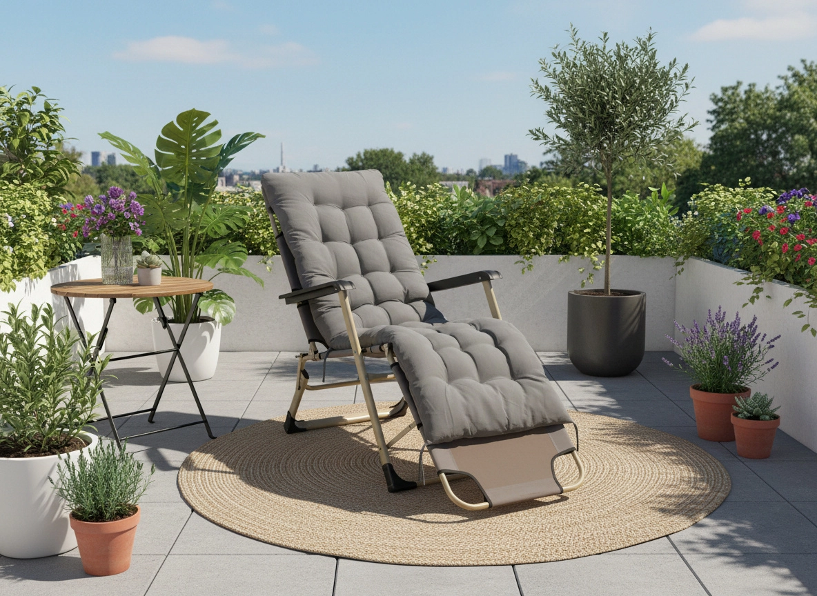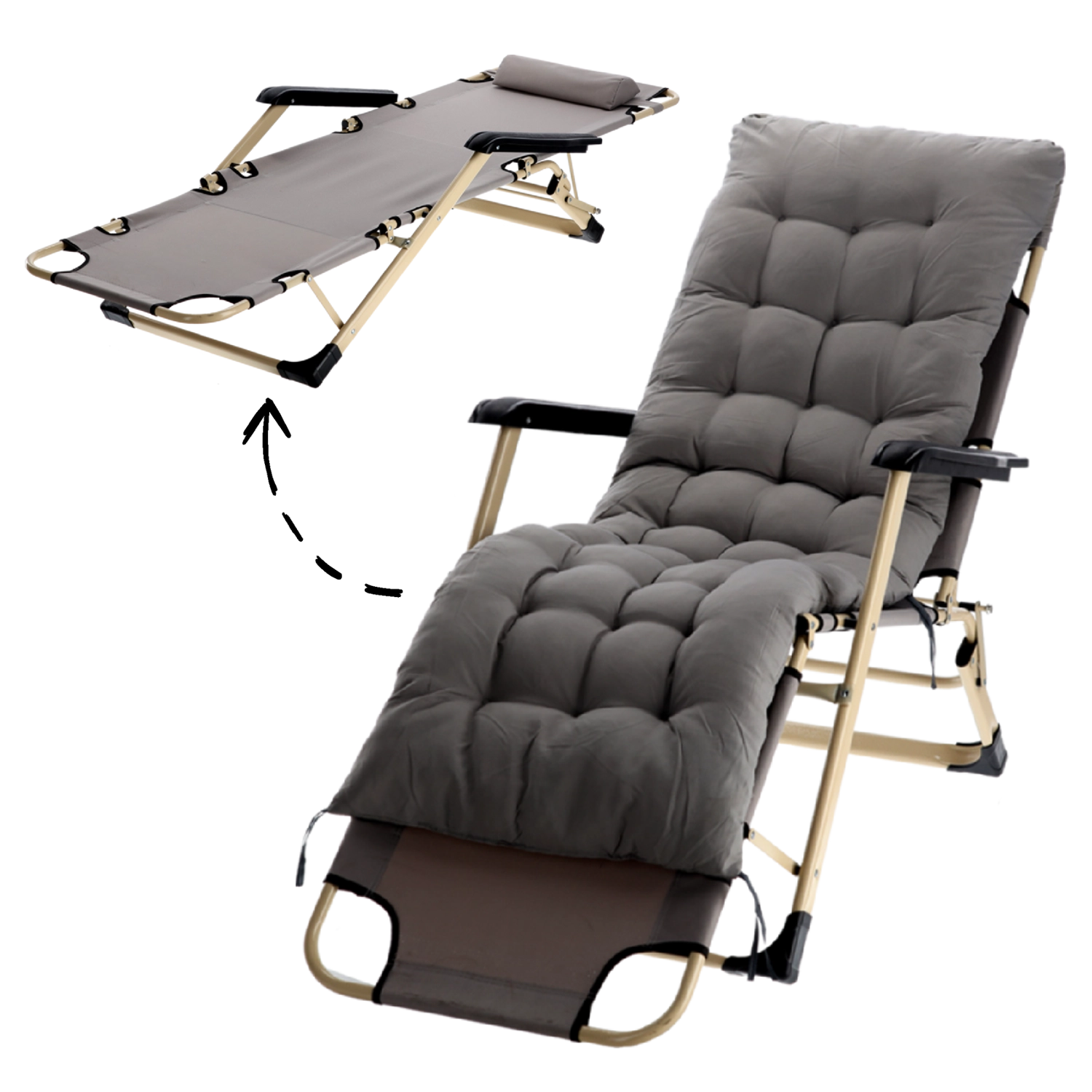Den praktiske 2-i-1 liggestol/stol kombinerer en stabil stålramme med slidstærkt Oxford-stof 600D x 300D og en kraftig, quiltet polstring. Den kan foldes sammen på et minut og tages med – ideel til haven, terrassen, ved poolen og på farten.