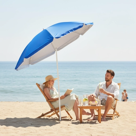 Nyd sommerdagene i komfort og tryghed. Denne strandparasol med en diameter på 155 cm og vippeled giver rigelig skygge til afslapning ved havet, poolen eller i haven. Holdbar 170T-polyester med UV-lag og pulverlakeret stål sikrer lang levetid og nem vedligeholdelse.
