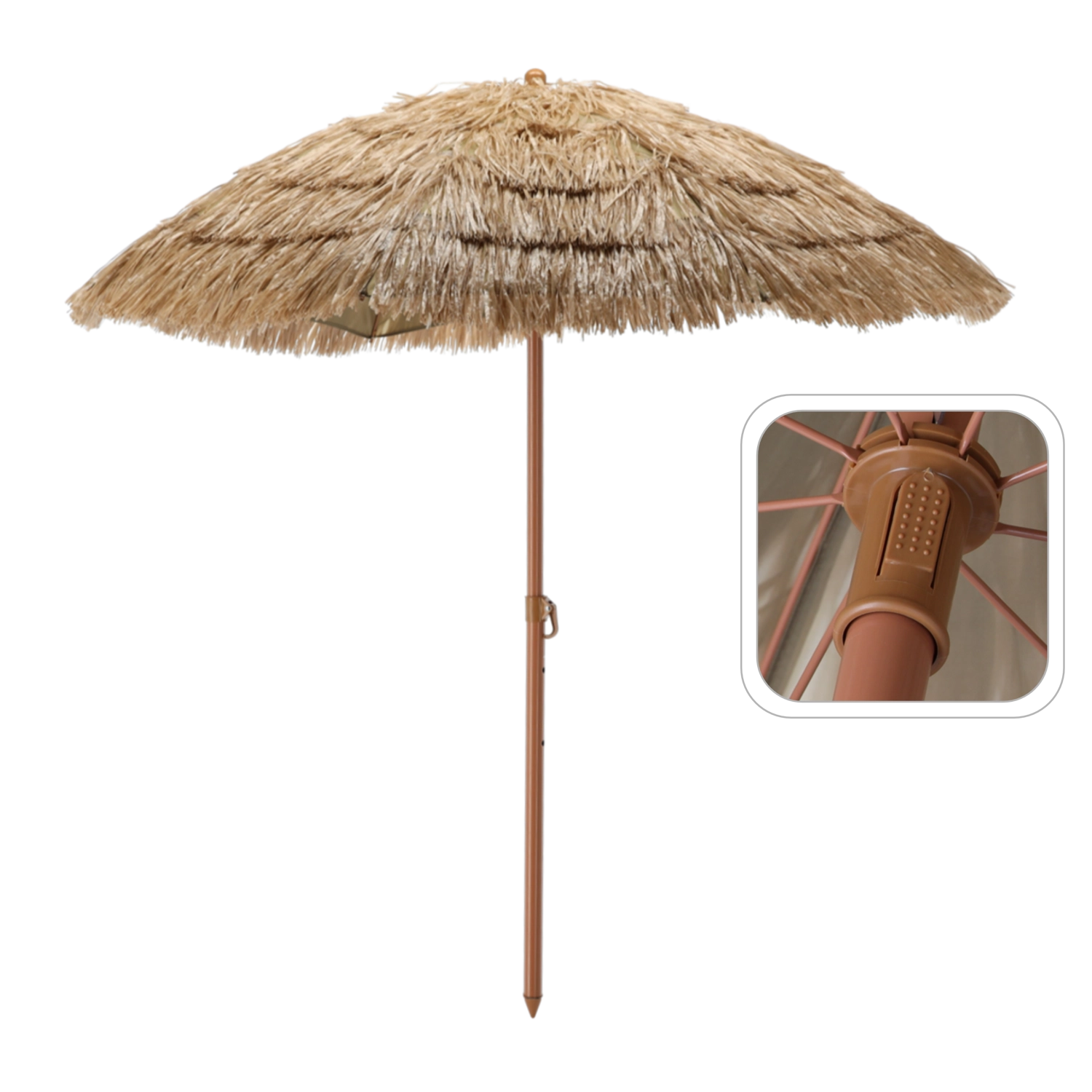 Den hawaiianske parasol med en diameter på 155 cm giver behagelig skygge selv på de varmeste dage. Takket være pulverlakeret stål og 8 stærke ribber er den stabil og robust, mens de dekorative PP-frynser skaber et autentisk tropisk look.