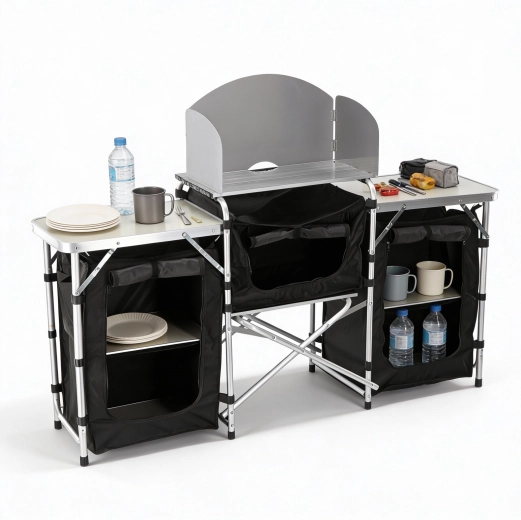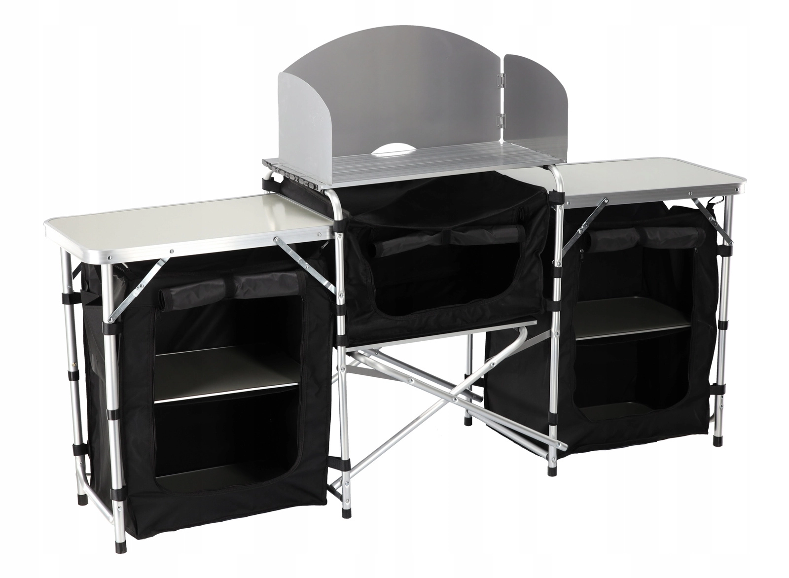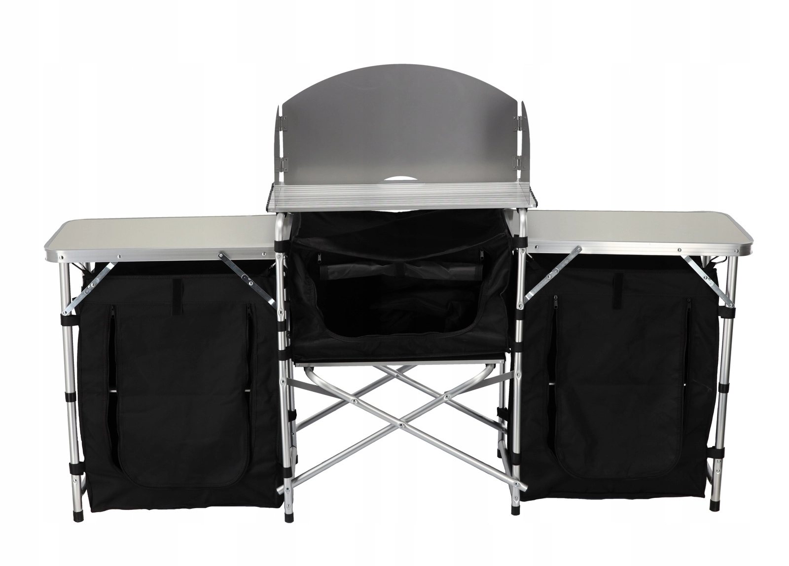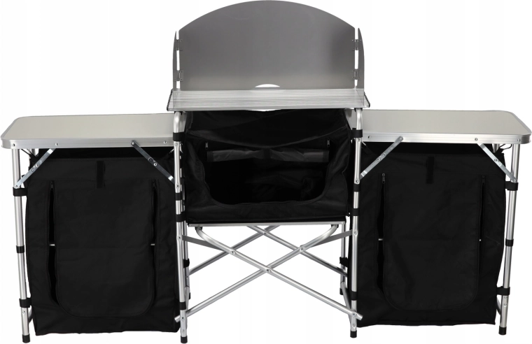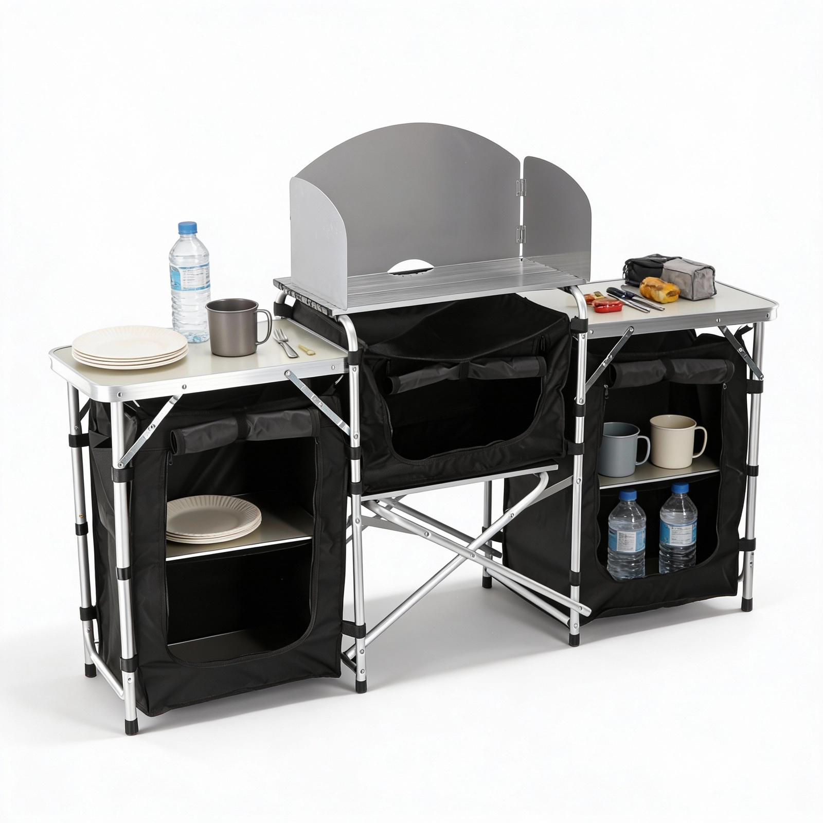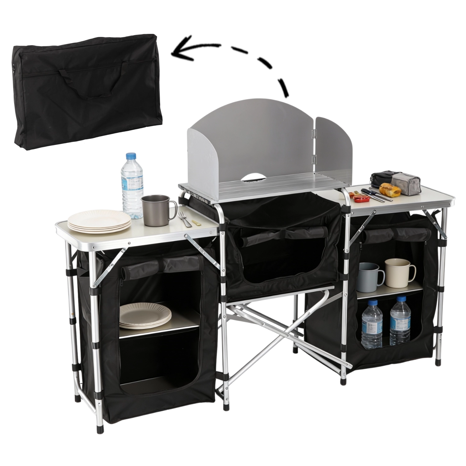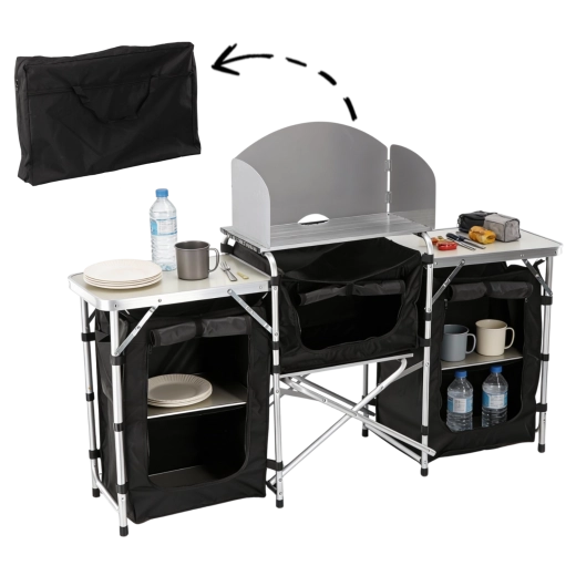 Dette sammenklappelige campingkøkken forvandler enhver lejr, have eller picnic til et velorganiseret kulinarisk base. Takket være aluminiums-konstruktionen er det let, men stabilt, arbejdsbordene giver rigelig plads til madforberedelse, og vindskærmen beskytter komfurflammen. To til tre tekstilskabe med lynlåse og hylder holder udstyret altid lige ved hånden og tørt.