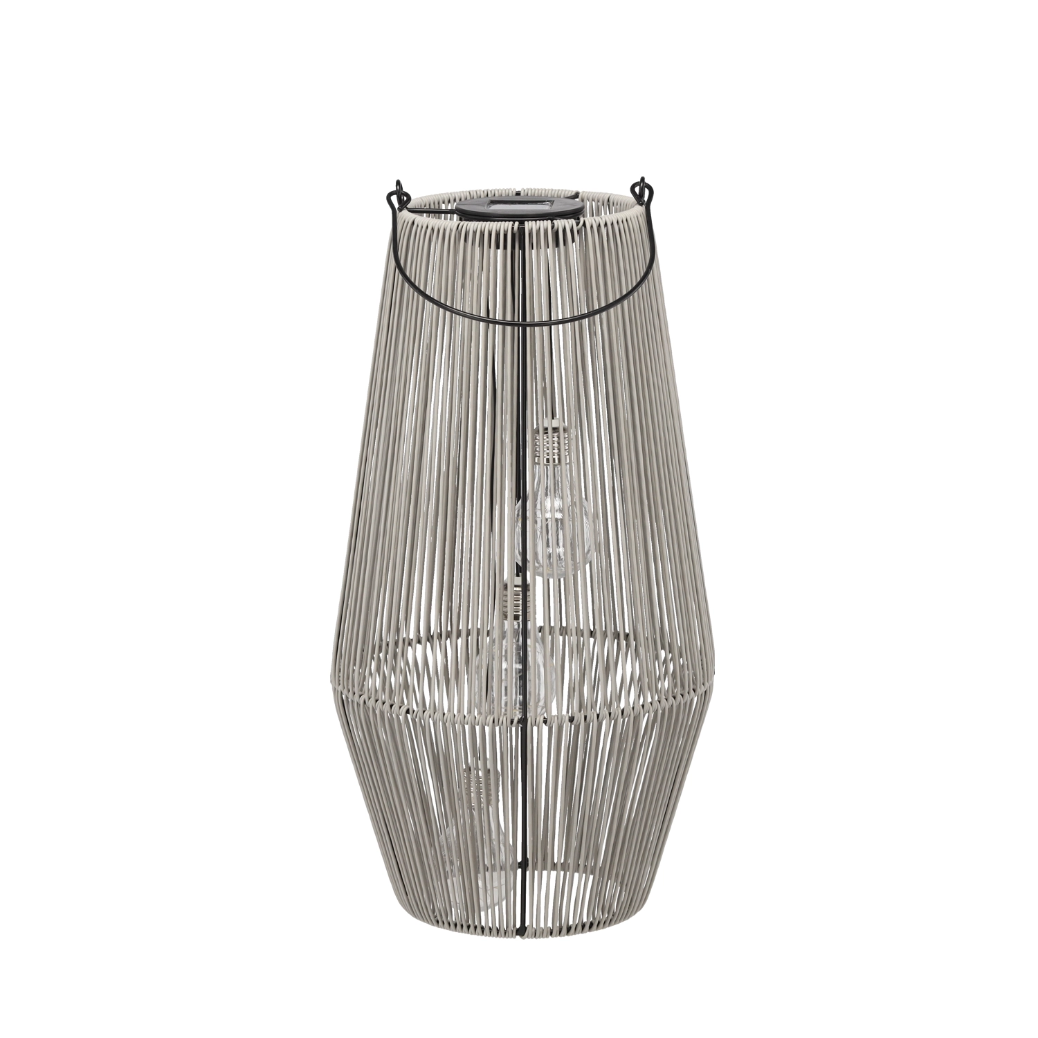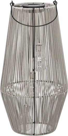 Denne stilfulde solcellelanterne er designet til udendørs brug – den oplades i løbet af dagen via det integrerede solpanel og tænder automatisk om aftenen med et behageligt, varmt lys. Den grå udførelse er alsidig og let at kombinere med andet møblement og tilbehør på terrasse eller i have.