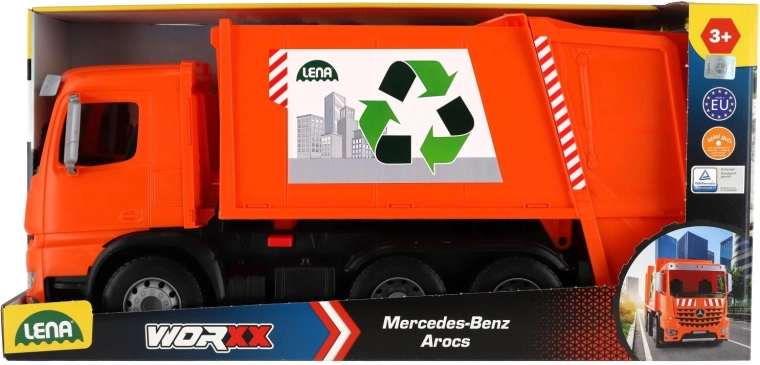 Skraldebilen MERCEDES AROCS fra LENA er et detaljeret køretøj til små teknikentusiaster. Takket være den robuste udførelse i kvalitets, holdbar plast og de stærke metalaksler klarer den daglig leg inde såvel som ude. Den funktionelle bagdel med sikring gør sikker pålæsning og tømning mulig.