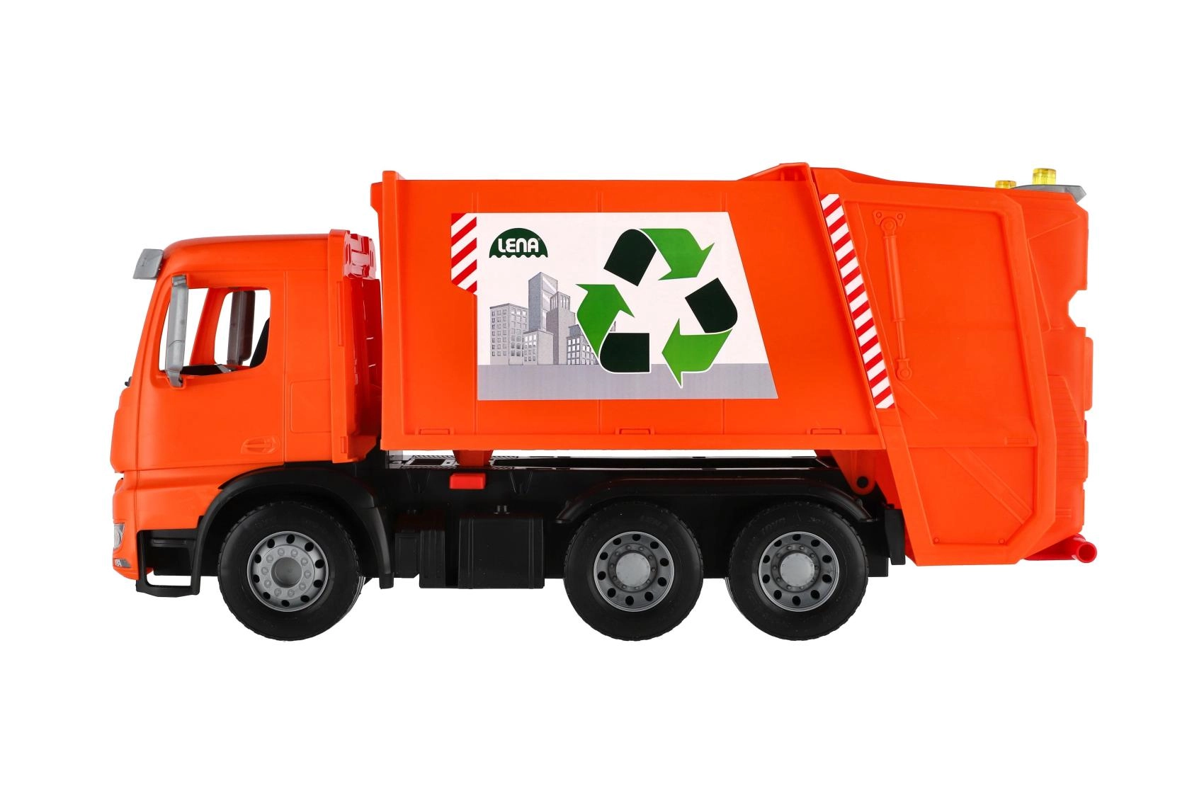 Den orange skraldebil MERCEDES AROCS fra LENA giver børn realistisk lege med affaldsindsamling. Den tilbyder robust plastkonstruktion, stærke metalaksler, sikring mod utilsigtet tipning og to skraldespande for endnu sjovere leg. Perfekt til udvikling af fantasi, koordinering og finmotorik både hjemme og i haven.