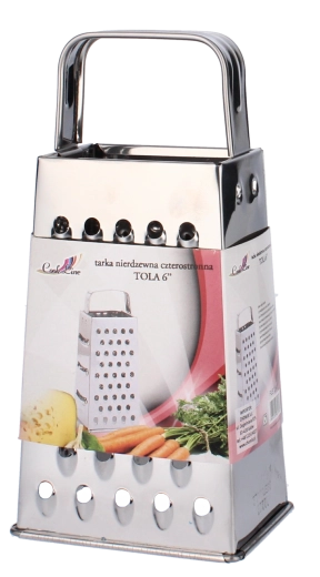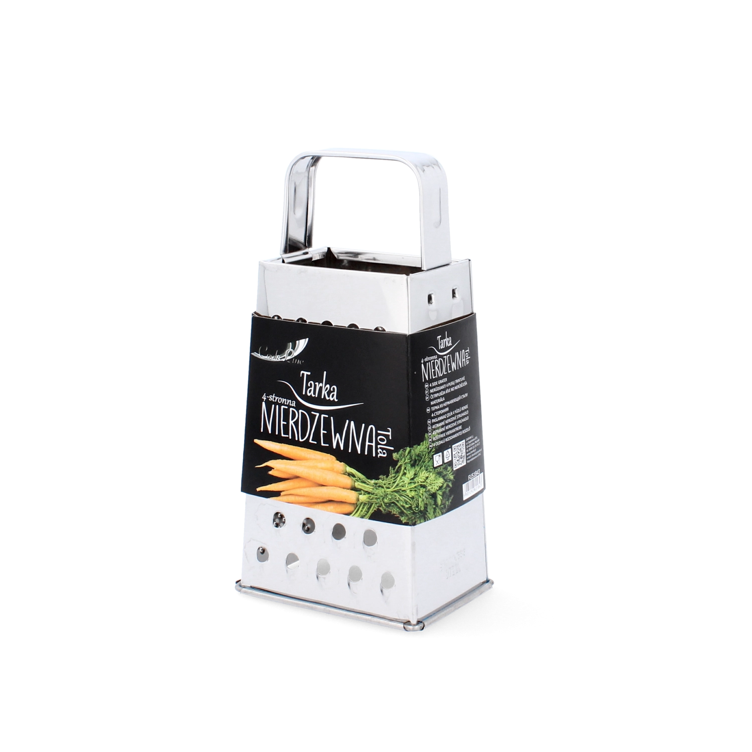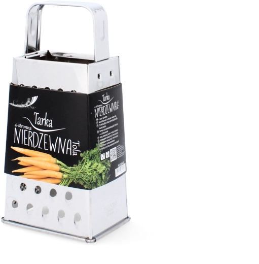 Praktisk og holdbart firsidet rivejern i rustfrit stål Tola med en højde på 17,5 cm, ideelt til daglig brug. Tilbyder 4 typer rivning til grøntsager, ost og frugt, har et ergonomisk design for behageligt greb og en skridsikker bund for sikker og stabil brug. Rustfrit stål sikrer lang levetid og modstandsdygtighed over for korrosion.