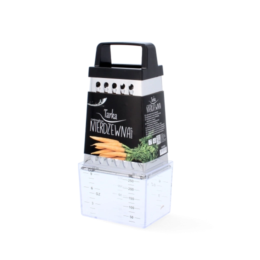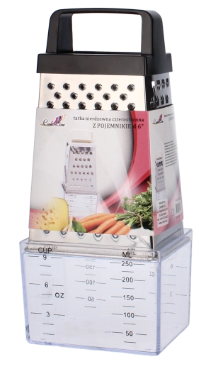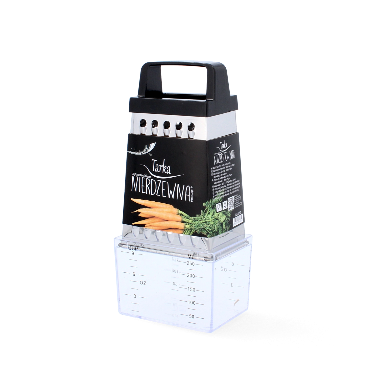 Gør forberedelsen lettere med det multifunktionelle rivejern i rustfrit stål med en højde på 20 cm. Den integrerede beholder opsamler de revne ingredienser, så køkkenbordet forbliver rent, og råvarerne nemt kan overføres til skål eller pande. Den høje kvalitet i rustfrit stål garanterer lang holdbarhed og korrosionsbestandighed.