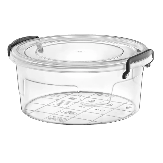 Den praktiske runde plastboks Multi Box med en kapacitet på 2,1 l er ideel til daglig opbevaring af madvarer. Takket være det gennemsigtige design kan du nemt kontrollere indholdet uden at åbne. Et tætsluttende låg med to klips sikrer hermetisk lukning, bevarer friskhed og forhindrer lugtudslip. Boksen er egnet til mikrobølgeovn, fryser og opvaskemaskine, hvilket gør den maksimal praktisk i ethvert køkken.