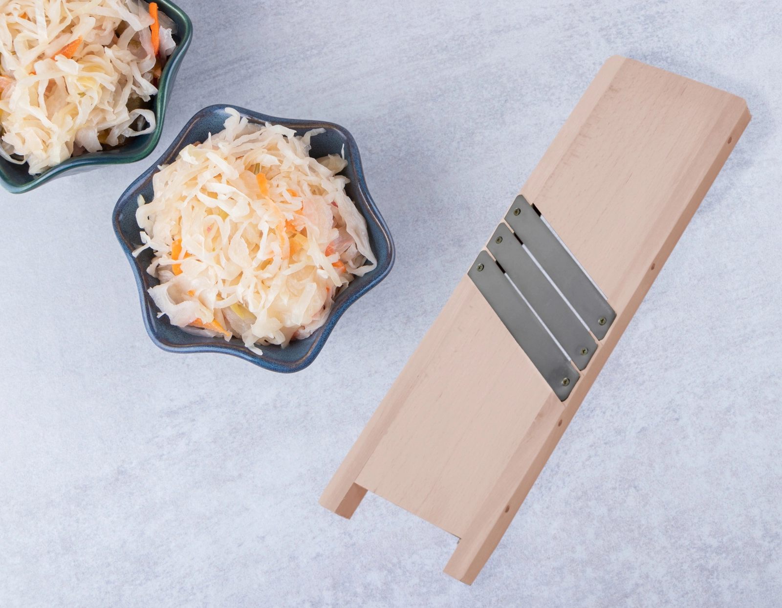 Tre parallelle knive i rustfrit stål sikrer ensartet skivetykkelse og sparer tid ved forberedelse af kål og grøntsager.