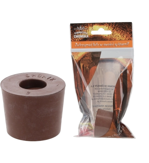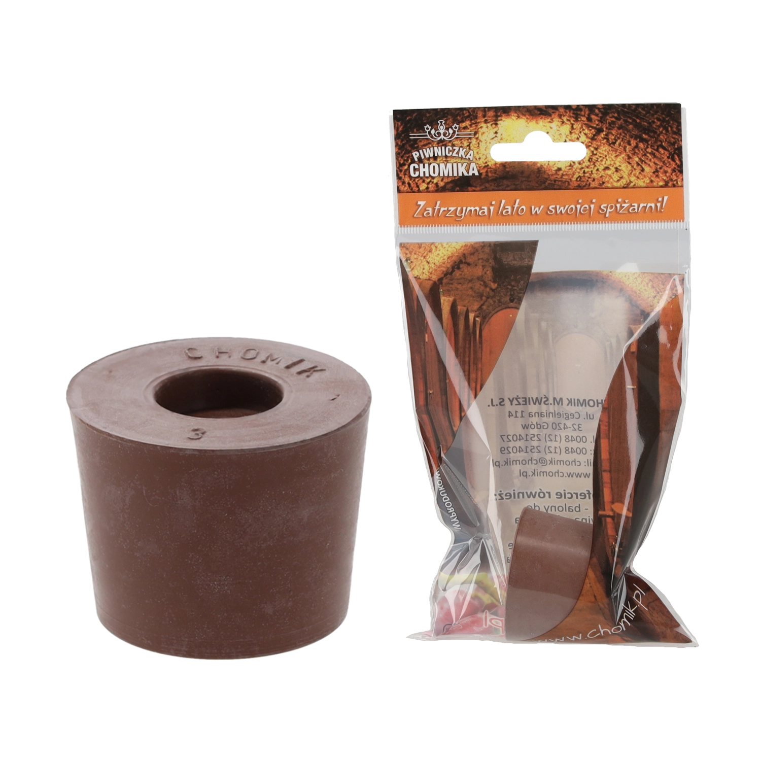 Gummiprop nr. 3 er en pålidelig løsning for hjemmevinmagere og alle, der fremstiller fermenterede drikke. Takket være de præcise mål og den elastiske konstruktion slutter den tæt og beskytter indholdet mod urenheder og luft. Hullet med en diameter på 10 mm er forberedt til en standard gærlås, som muliggør kontrolleret udledning af CO₂ under fermenteringen.