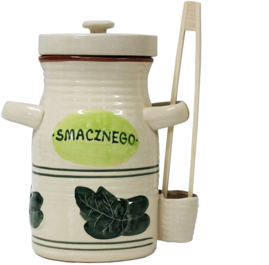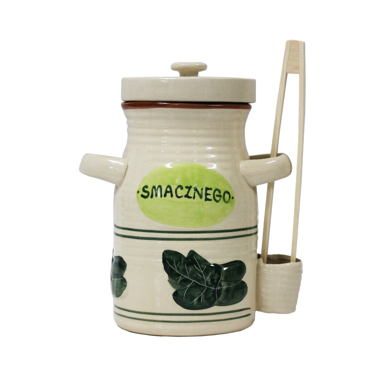 Medfølger gør et solidt keramisk låg for et stabilt miljø under fermentering og en trætang (22 cm) til ren og hygiejnisk udtagning af agurker eller andre lækkerier. Den praktiske sideloomme til tang sikrer, at du altid har den ved hånden. Den elegante hvide glasur med relief af agurker og påskriften “Smacznego” passer perfekt i ethvert køkken.