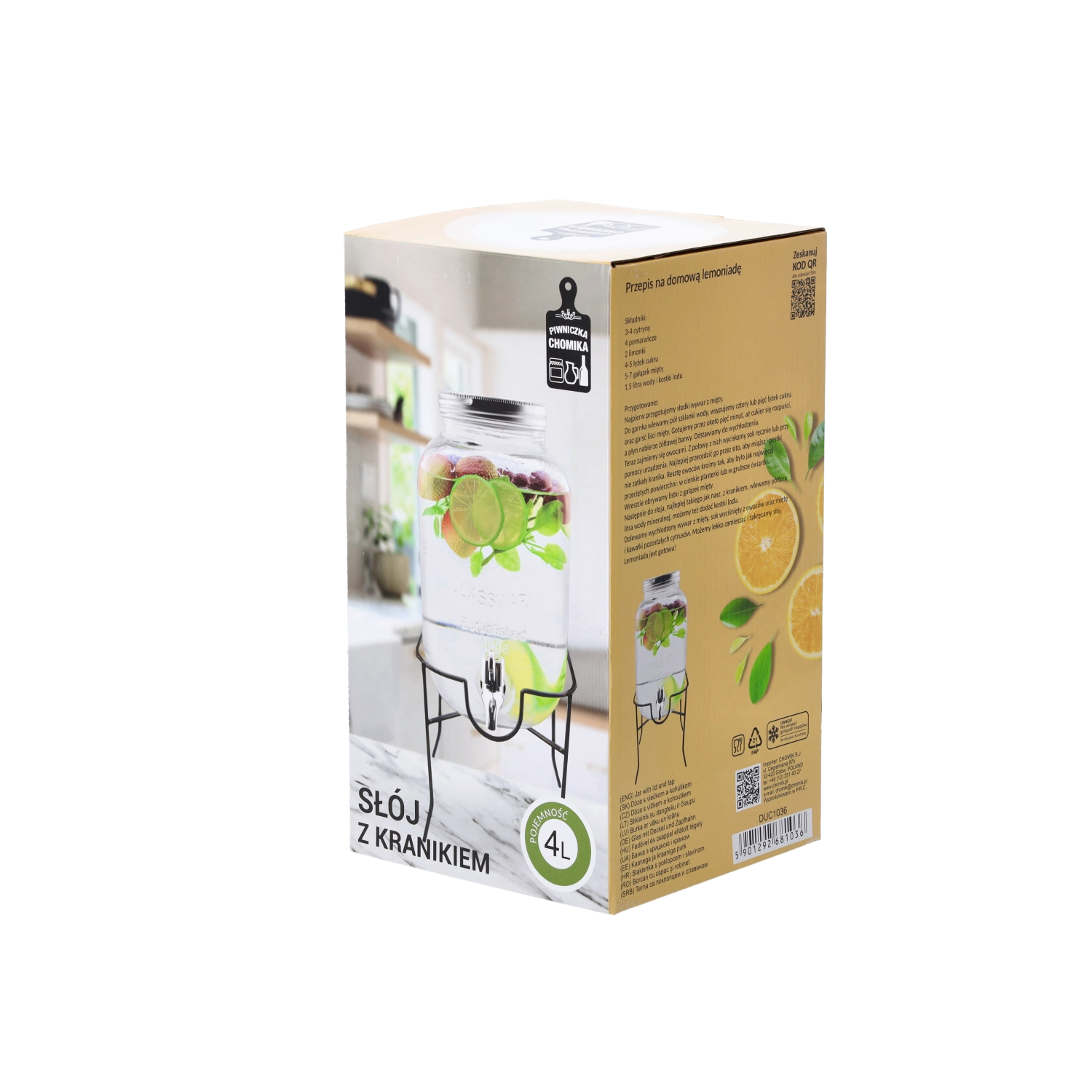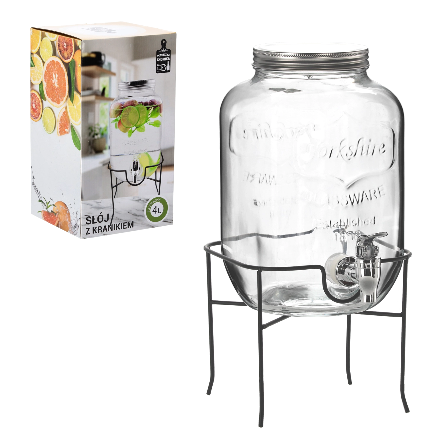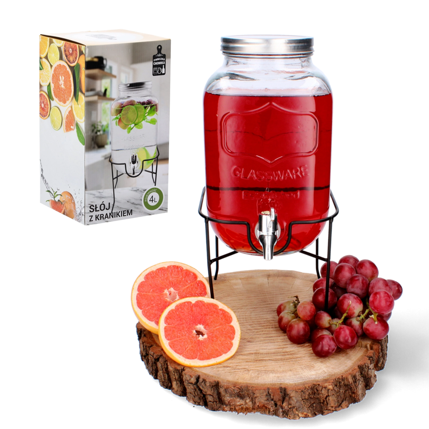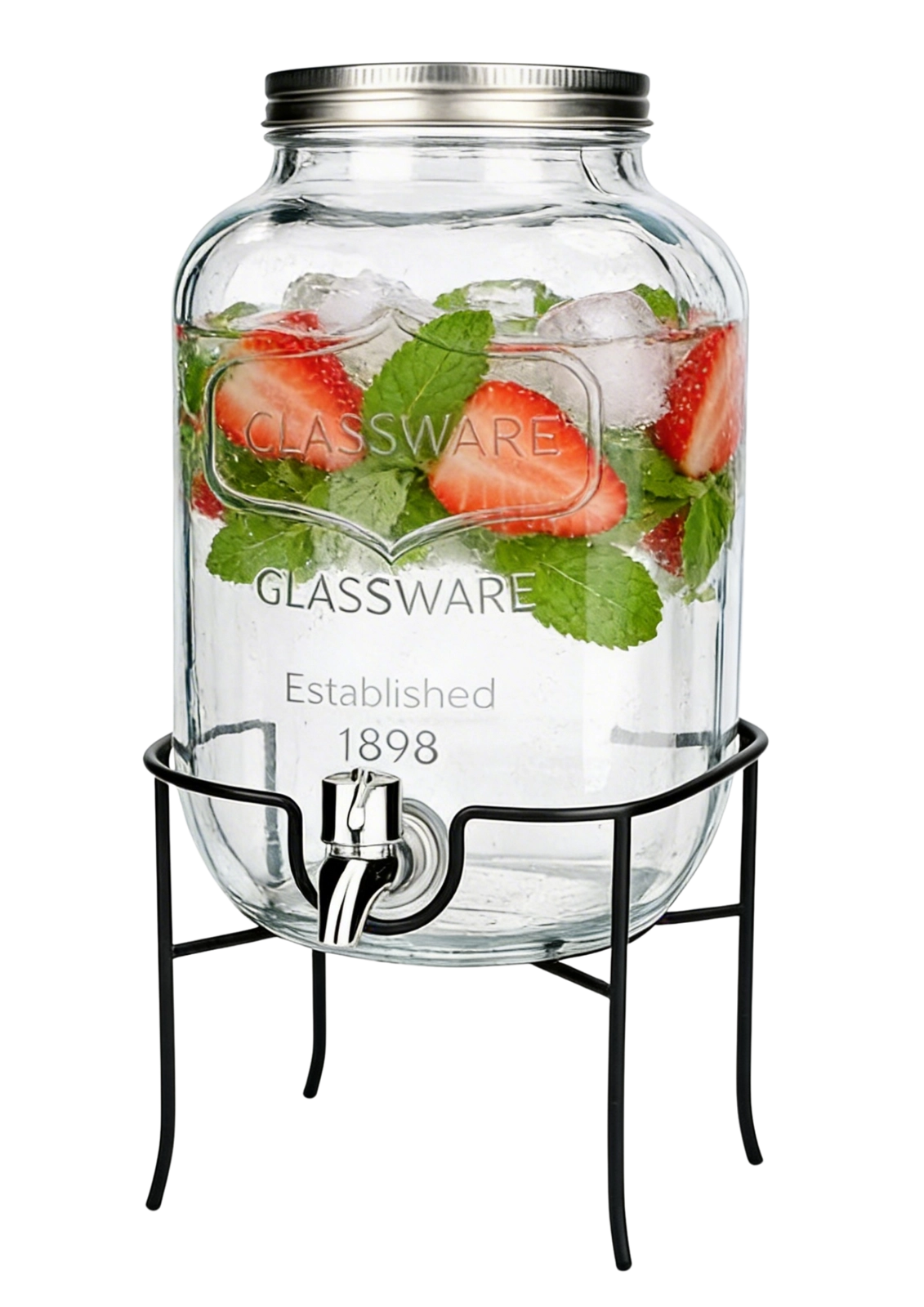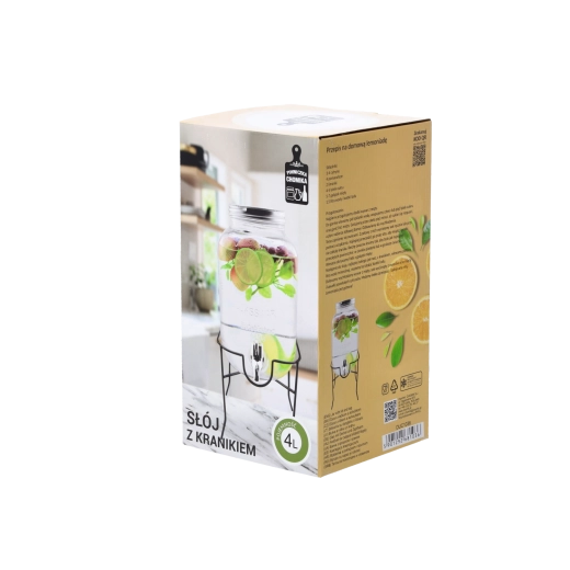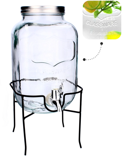 Det stabile metalstativ løfter beholderen til den ideelle højde, så det er nemt at hælde op i både høje glas og karafler. Det gennemsigtige glas egner sig til infuseret vand med frugt, hjemmelavede lemonader og iste og bliver et dekorativt element i dit køkken, spisestue eller udendørs siddemiljø.