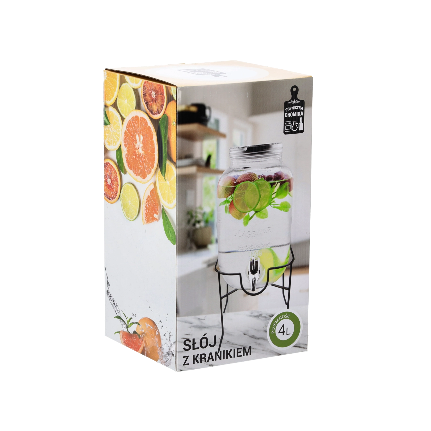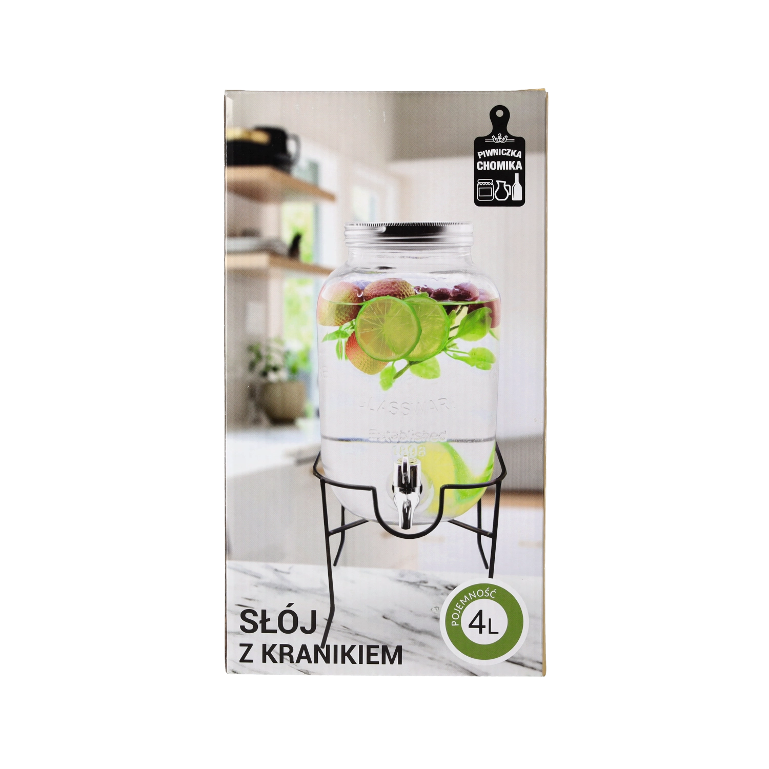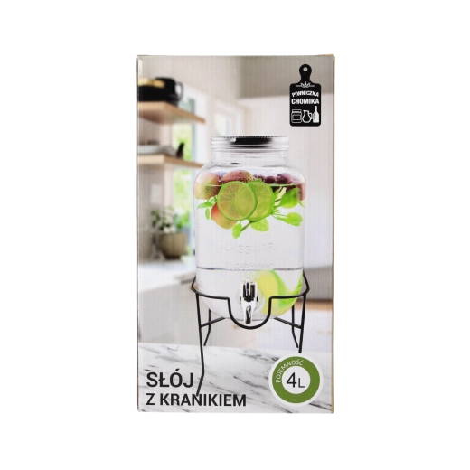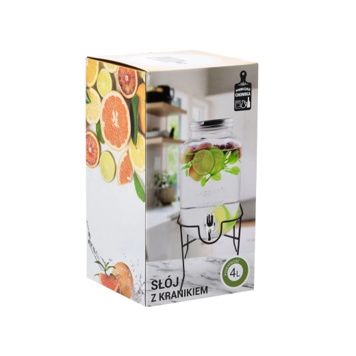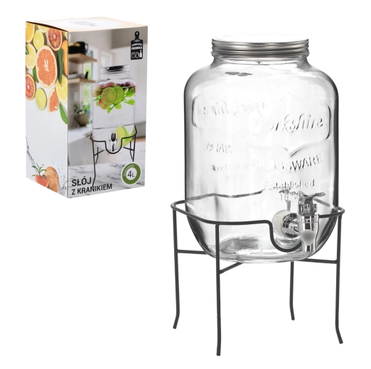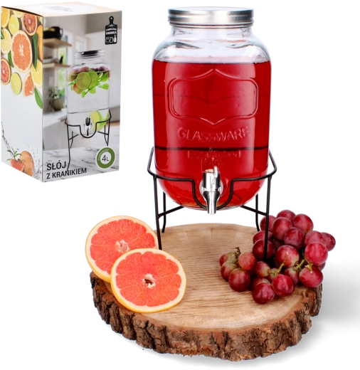 Denne glasdrinksdispenser forener funktion og design. Kapaciteten på 4 l rækker til familieselskaber og større sammenkomster, mens det metallåg beskytter drikken mod snavs og insekter. Den praktiske hane sikrer jævn dosering, så du undgår spild og rod på bordet.