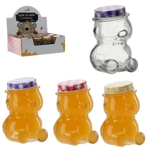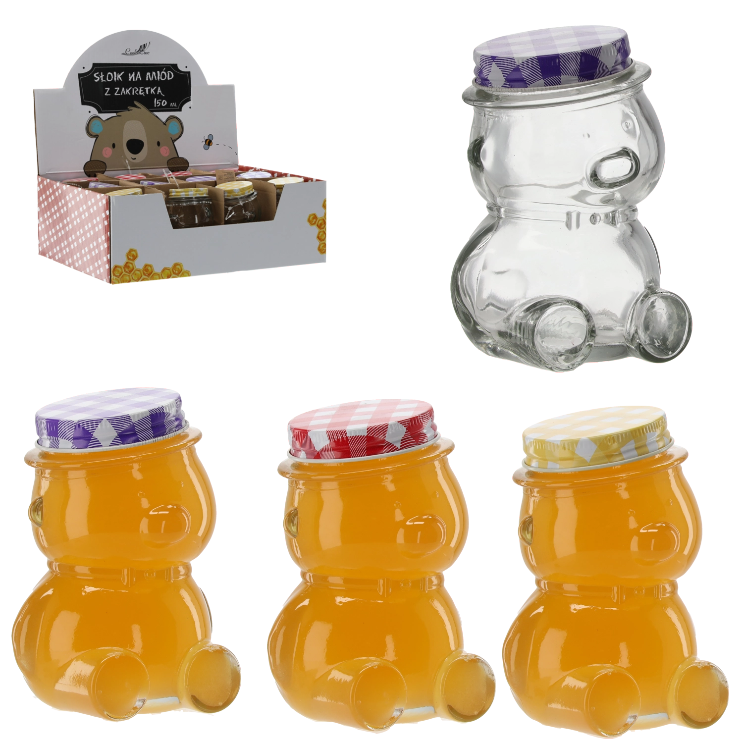 Sød glasbeholder formet som en bjørn med volumen på 150 ml – ideel til honning, marmelader, krydderier og små fødevarer. Takket være det tætsluttende skruelåg holder indholdet sig friskt længere og er perfekt både til hjemmebrug og til præsentation i butik. Fås med låg i forskellige farver for nem identifikation af indhold.