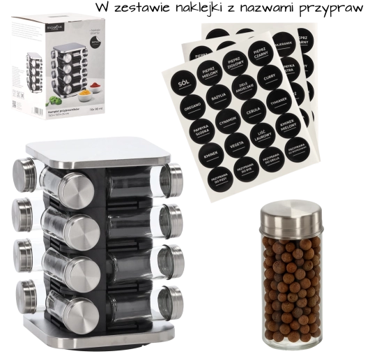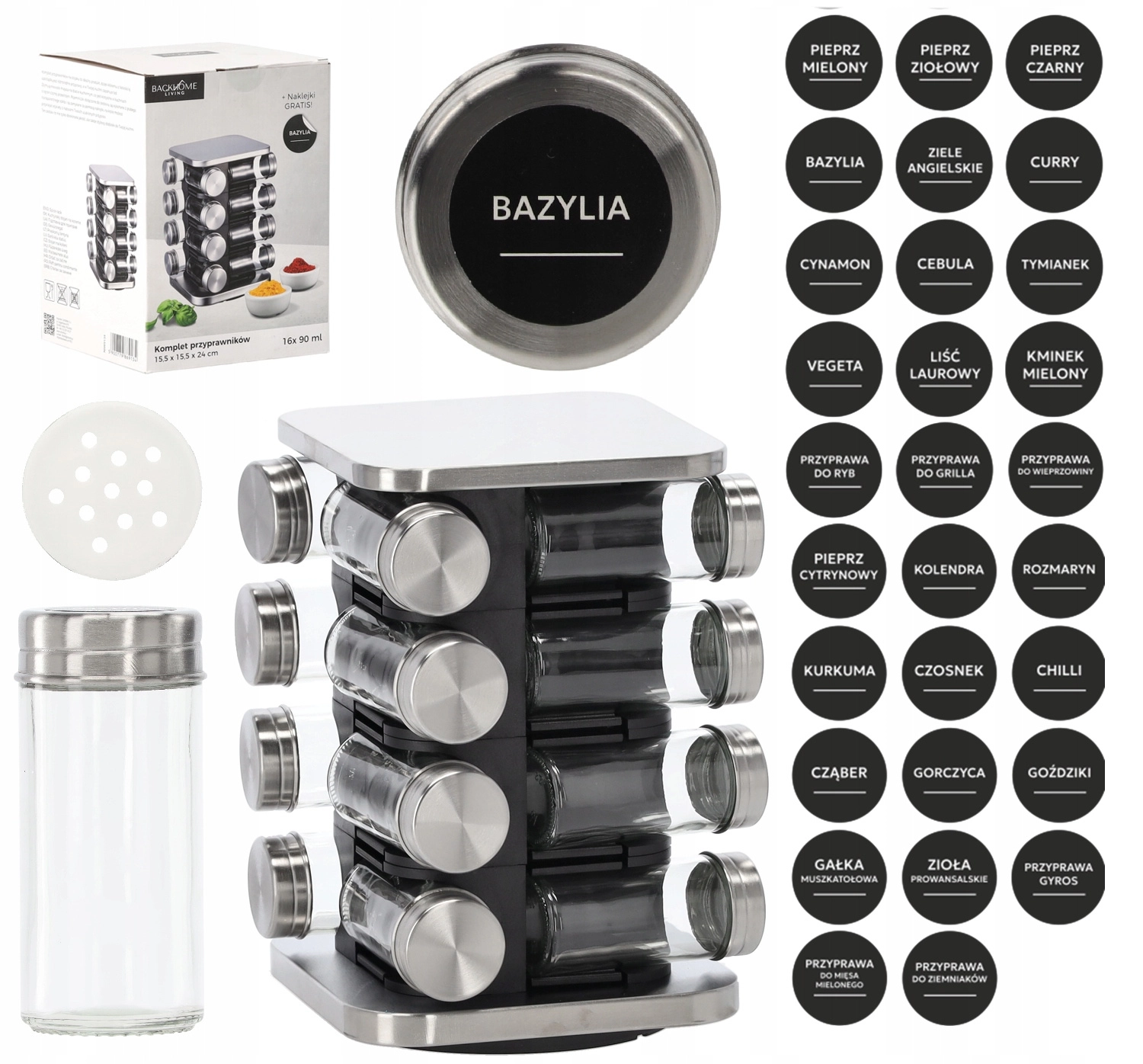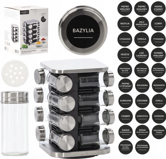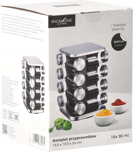 Elegant kvadratisk krydderihylde med mål 15,5 × 15,5 × 24 cm, der giver overskuelig opbevaring og hurtig adgang til dine yndlingskrydderier. Indeholder 16 transparente glas-krydderiglas med skruelåg i stål og en praktisk drejekonstruktion for nem betjening. Der medfølger et sæt med 38 etiketter til let mærkning af glassene.