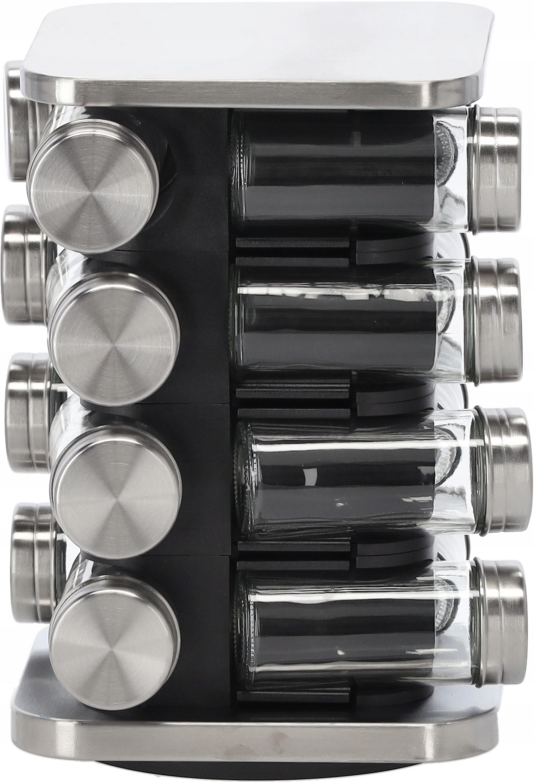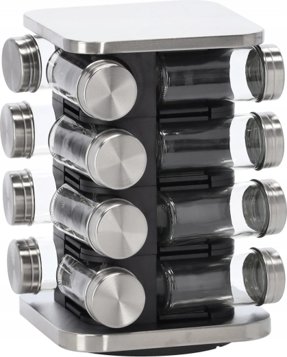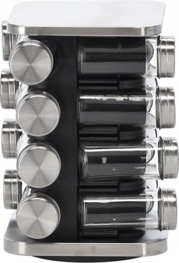 Hold styr på køkkenet og hav altid dine krydderier lige ved hånden. Denne dreiende krydderi-organizer kombinerer et moderne sort‑sølv look med gennemtænkt funktionalitet. Den kompakte base sparer plads på bordpladen, og den kvadratiske opstilling i 4 kolonner med 4 glas giver hurtigt overblik.