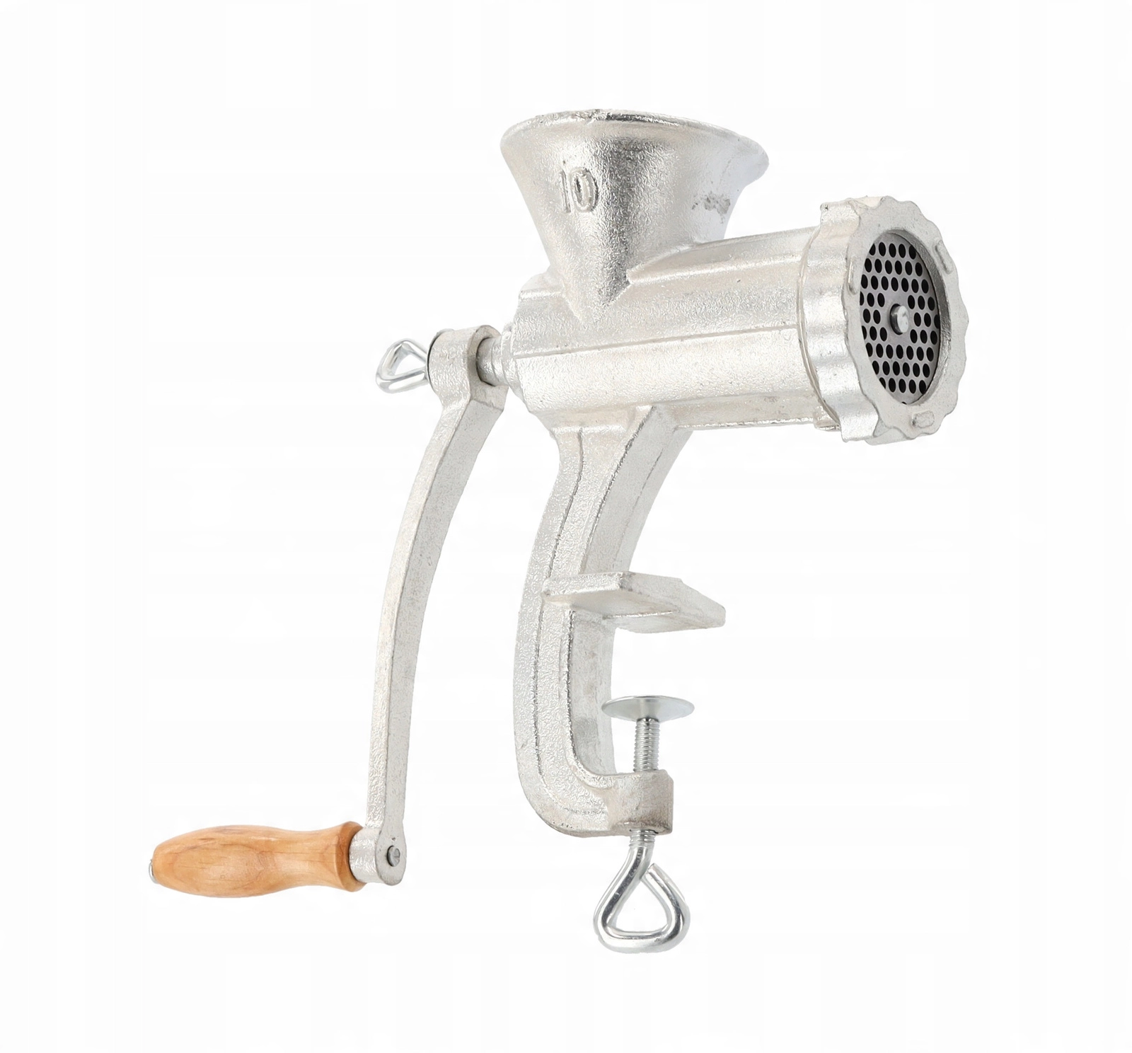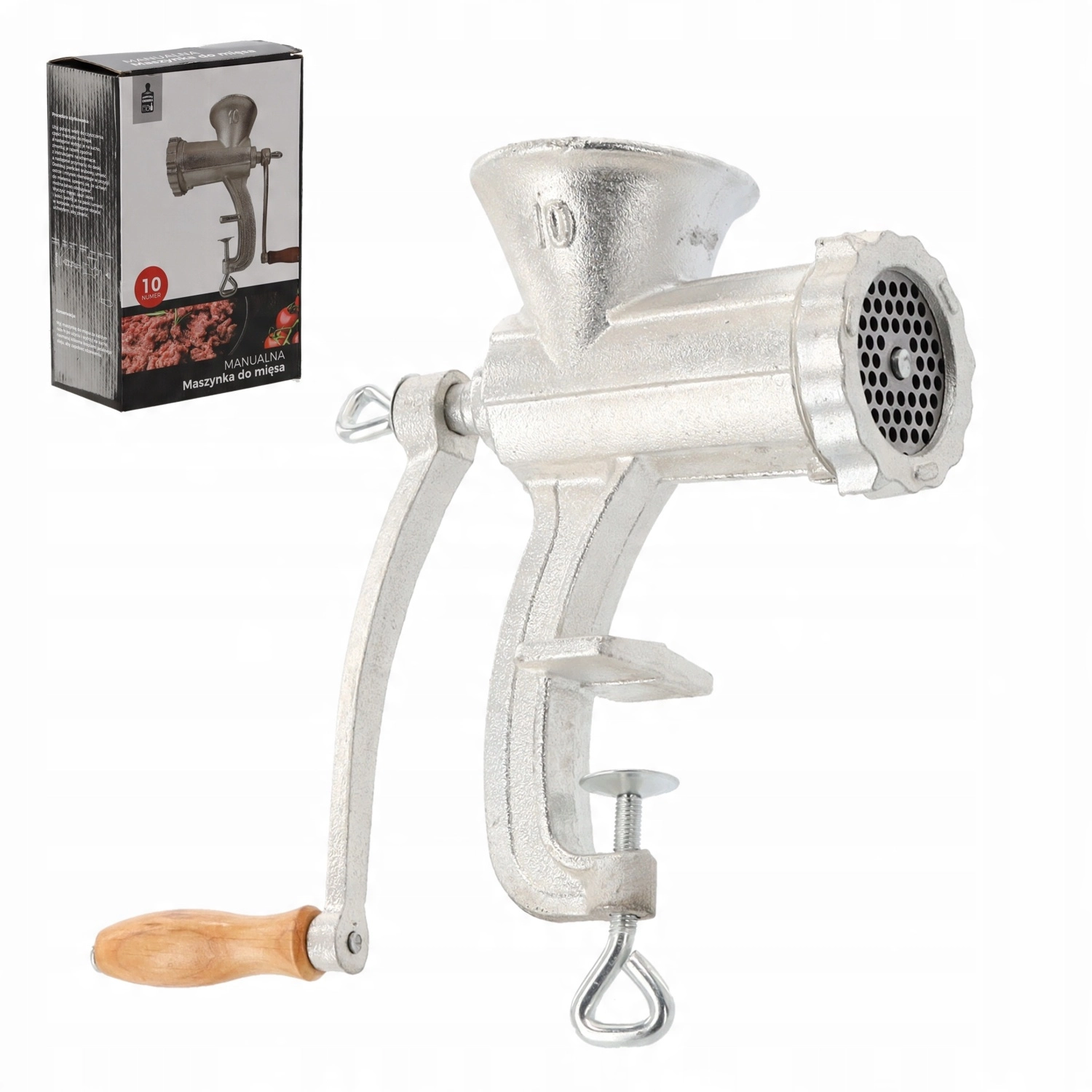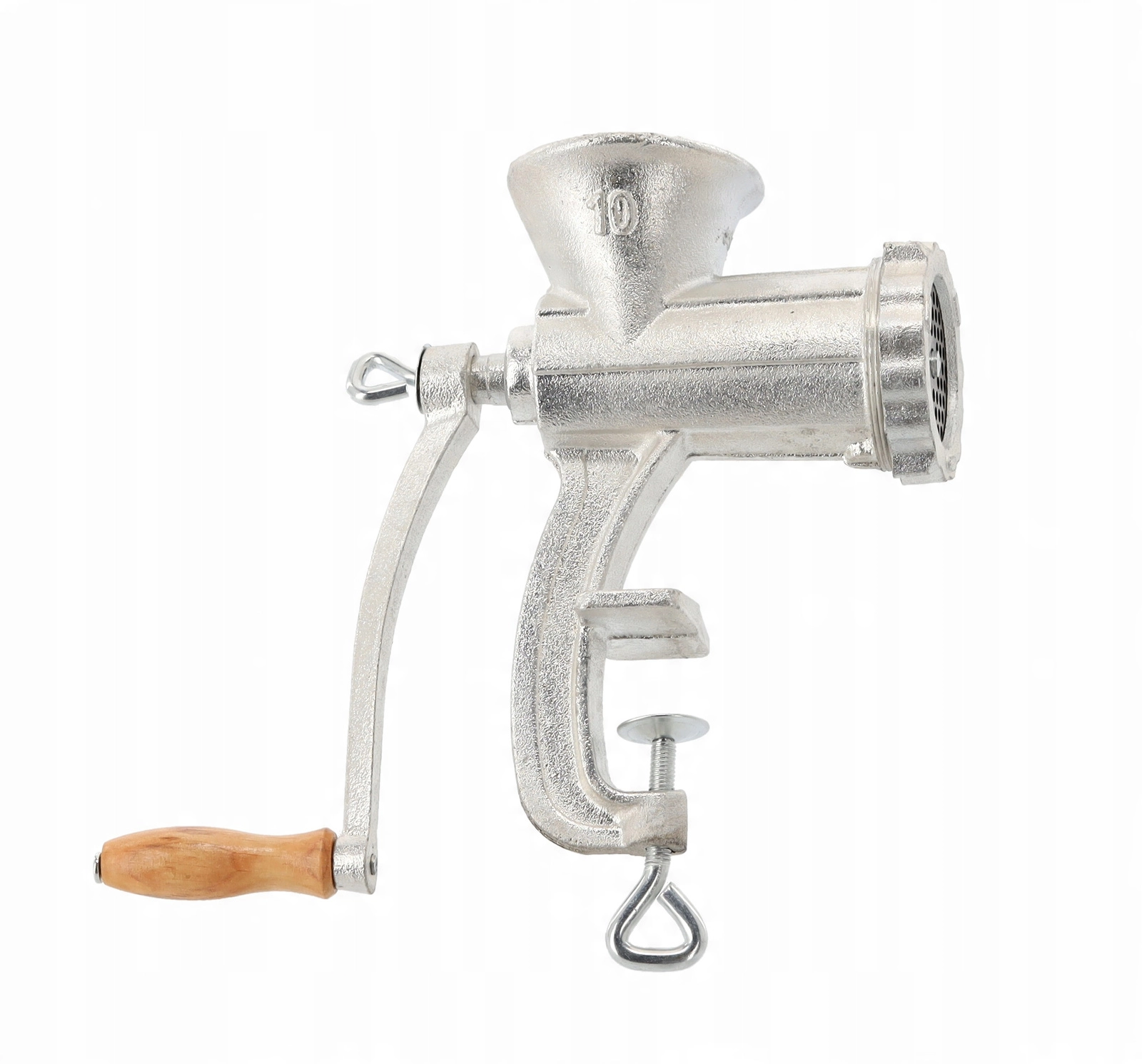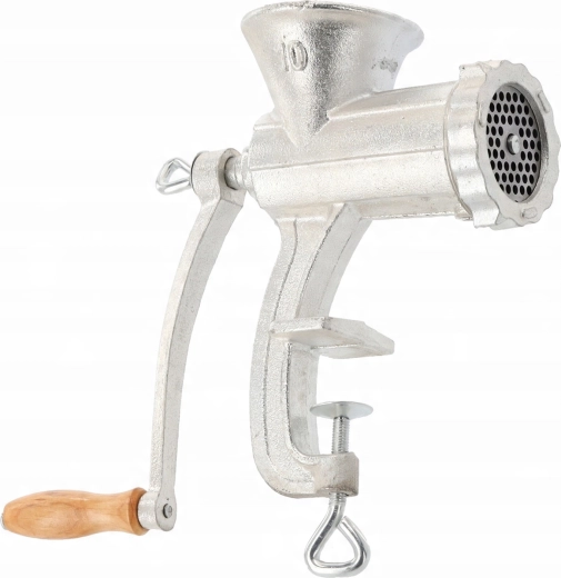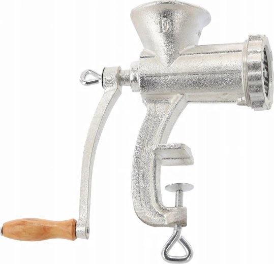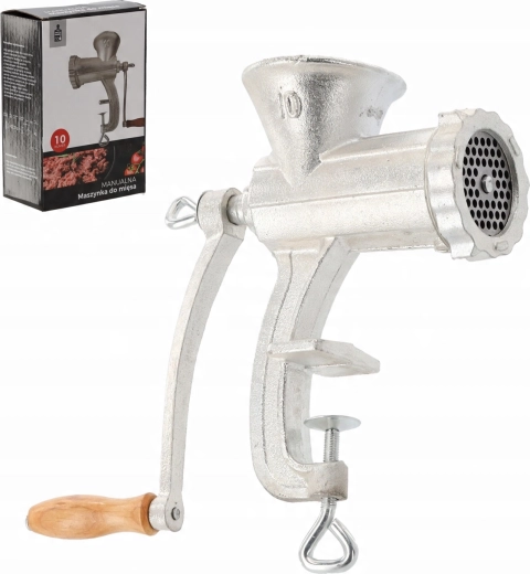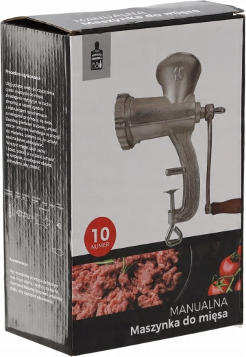 Pålidelig manuel kødhakker nr. 10 er fremstillet af robust støbejern og egner sig til daglig brug i køkkenet. Den tilbyder effektiv hakning af okse-, svine-, fjerkræ- og fiskekød. Takket være den solide bordklemme forbliver den stabil, stålknive med høj hårdhed sikrer jævn drift, og nem adskillelse gør rengøring let.
