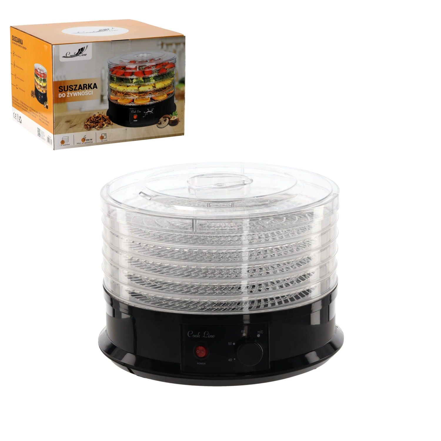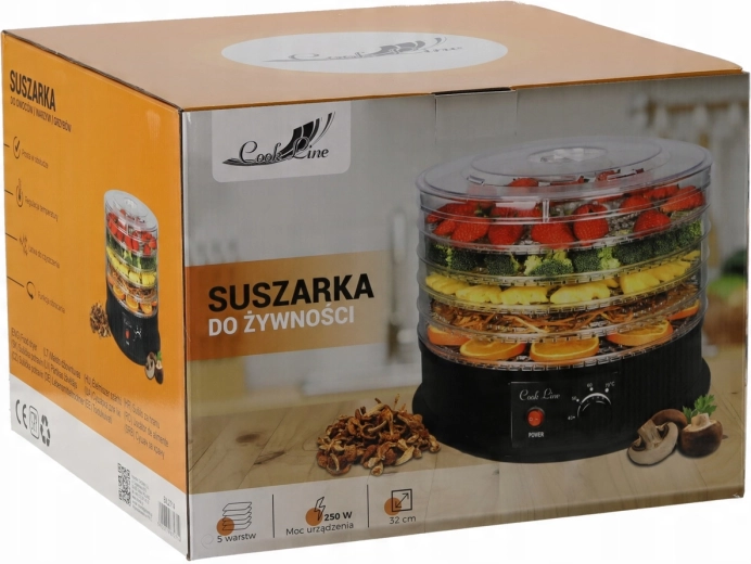 Madtørreren med en diameter på 32 cm og en effekt på 250 W er ideel til daglig brug i hjemmet. Takket være de fem rummelige skåle (op til 1 kg hver) laver du nemt sprøde æble- eller bananchips, frugtstrimler, urter og te eller tørret kød. Den justerbare temperatur på 35–70 °C gør det muligt præcist at tilpasse tørringen til de enkelte ingredienser.