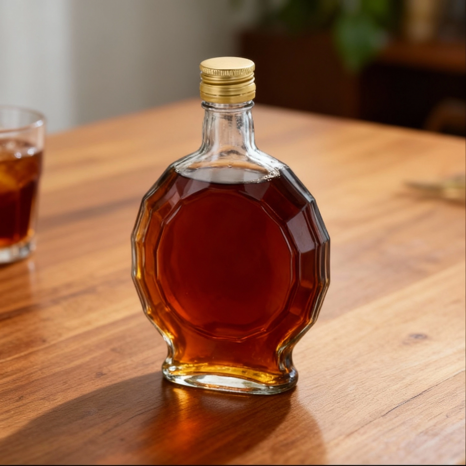 Den elegante glasflaske Medalion med en kapacitet på 250 ml udmærker sig ved sin ottekantede form, som giver drikkevarerne et sofistikeret udseende. Det gennemsigtige glas fremhæver smukt farven og klarheden af hjemmelavede likører, vine eller sirupper, mens det skruelige låg sikrer tæt lukning og bevarer friskhed og aroma.