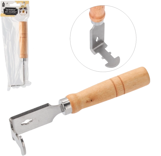 Denne holdbare skraber er en uundværlig hjælper for enhver biavler. Det specialformede metalblad med profiludskæringer gør det muligt at rengøre både øvre og side-lister på rammer, inklusive riller til tråde, i dybden. Den lette men robuste konstruktion med træhåndtag giver et sikkert greb og præcis kontrol over trykket ved afskrabning af propolis og voks.