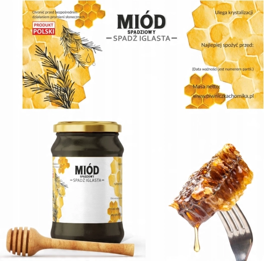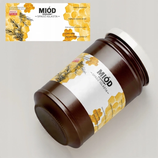 Gør den professionelle mærkning af honningglas nemmere med kvalitetsetiketter beregnet til honningdug (spad) fra nåletræer. Takket være tydelige felter kan forbrugeren let identificere honningtypen og vigtige oplysninger om sidste anvendelsesdato.