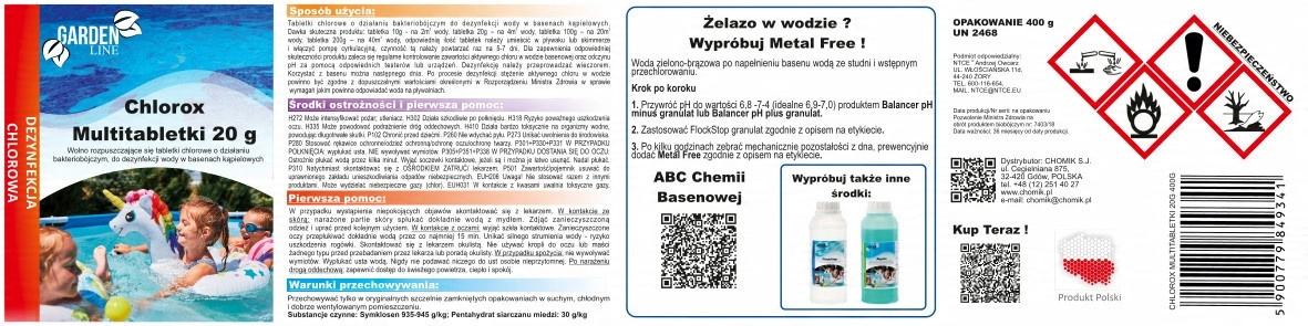 Hold poolvandet helt rent og hygiejnisk med CHLOROX 20 g tabletter i en pakke på 400 g. Disse multitabletter sikrer effektiv desinfektion, hæmmer algevækst og hjælper med at holde vandet krystalklart. Takket være den praktiske 20 g-form er doseringen nem og præcis, påføres via flyder eller skimmer, og virkningen varer i 5–7 dage.