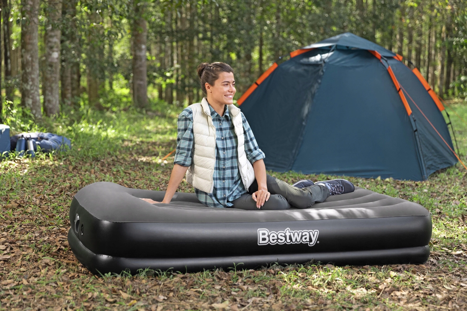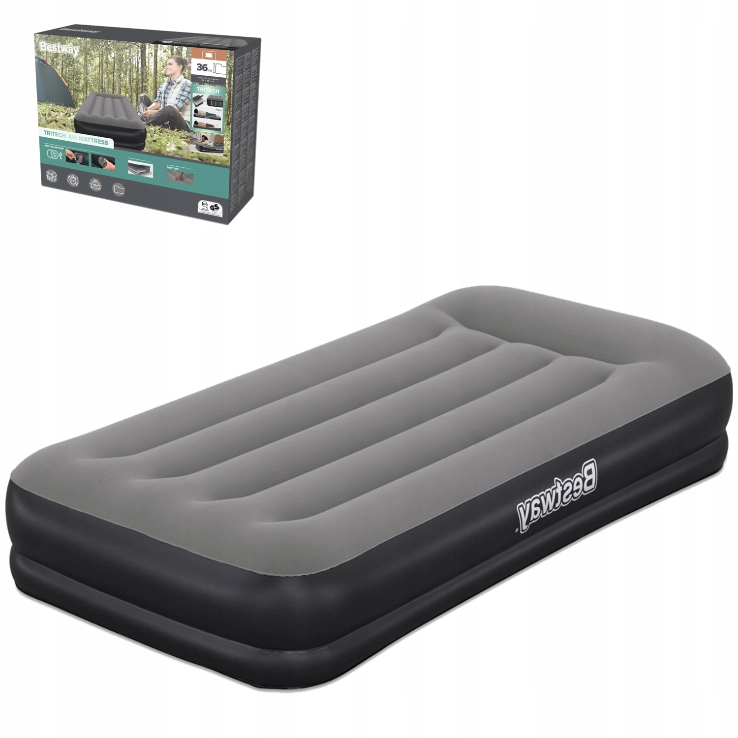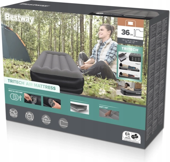 Den oppustelige seng BESTWAY TRITECH kombinerer stabilitet og komfort. Det trelags Tritech-kerne med polyester-net forstærket med PVC sikrer langvarig formstabilitet, mindre lufttab natten over og en behageligt fast kropsstøtte. Den forhøjede profil på 36 cm gør det lettere at komme op og isolerer samtidig bedre mod kulden fra gulvet.