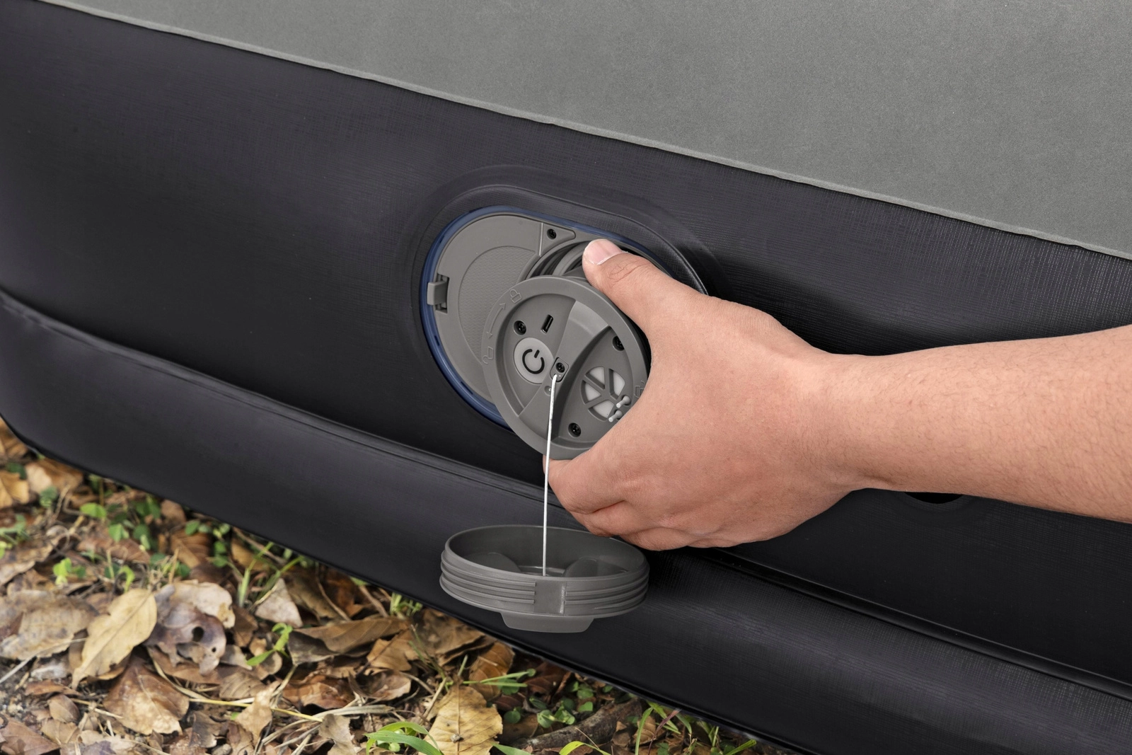 En integreret AC-pumpe 220–240 V er inkluderet til hurtig oppustning og tømning. Den ruskindsflockede overflade er blød, skridsikker og let at vedligeholde. En praktisk hurtigudluftningsventil og en medfølgende reparationslap gør brug og service nem både hjemme og på farten.