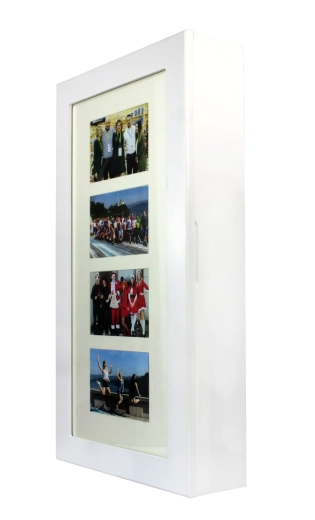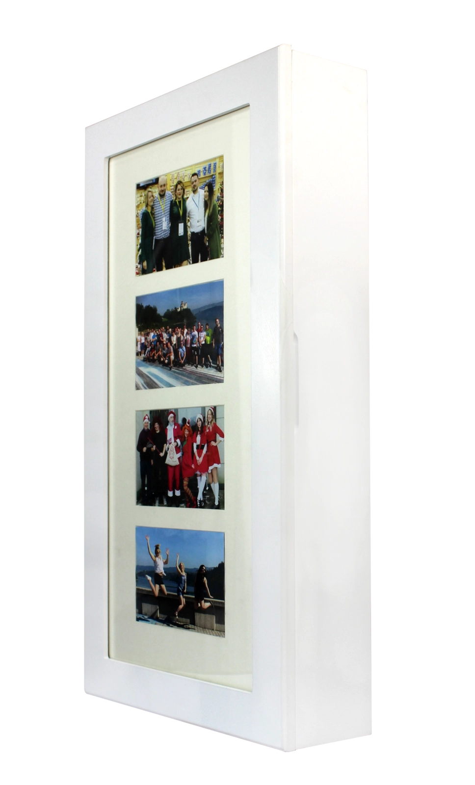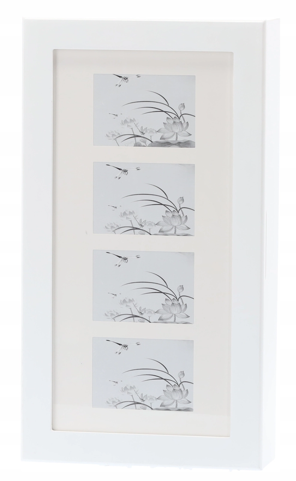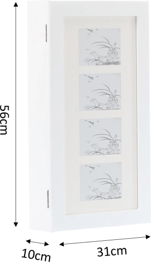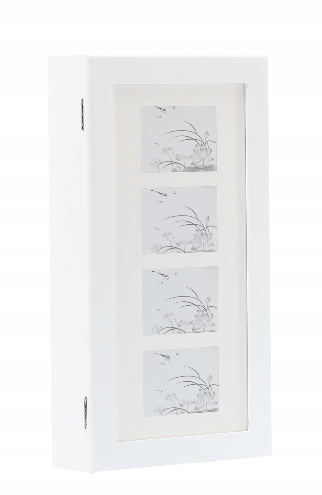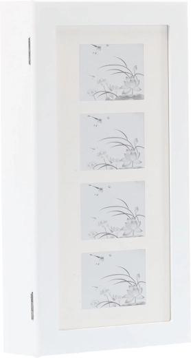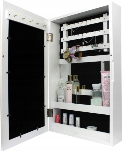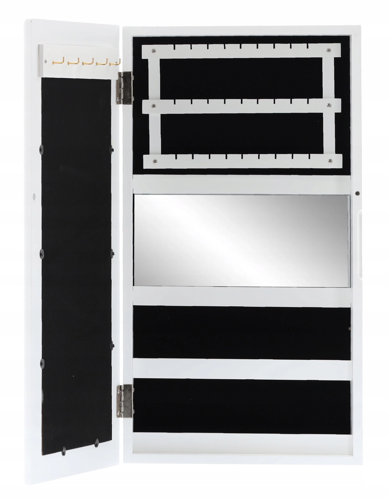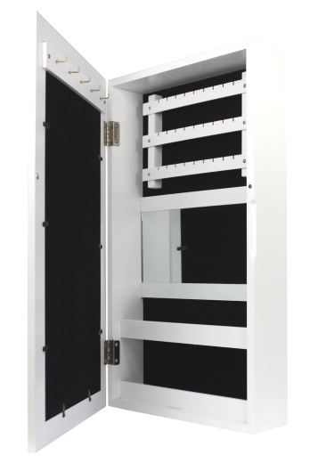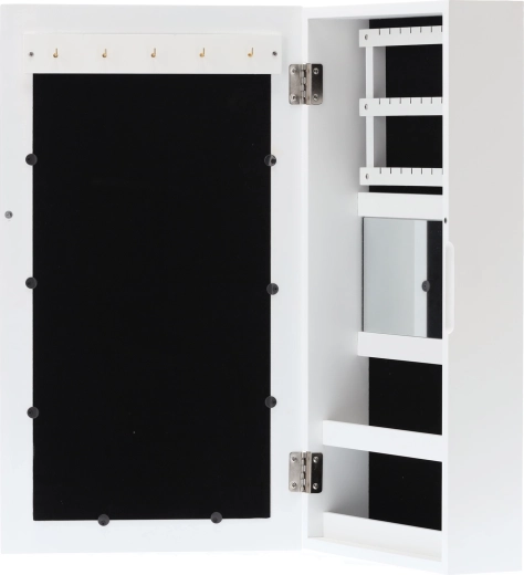 Elegant vægmonteret smykkeboks i hvid holder alle dine skatte overskueligt samlet ét sted. Indeni finder du kroge til halskæder og armbånd, lister til øreringe, bløde rækker til ringe og ure, praktiske hylder og et indbygget spejl. Sort fløjlspolstring beskytter smykker mod ridser, de kompakte mål sparer plads, og det moderne tidløse design passer ind i enhver indretning.