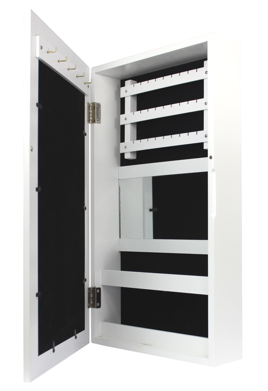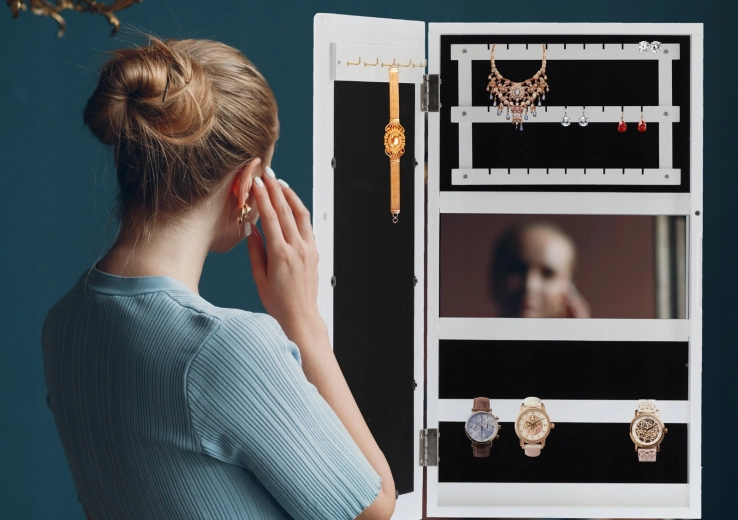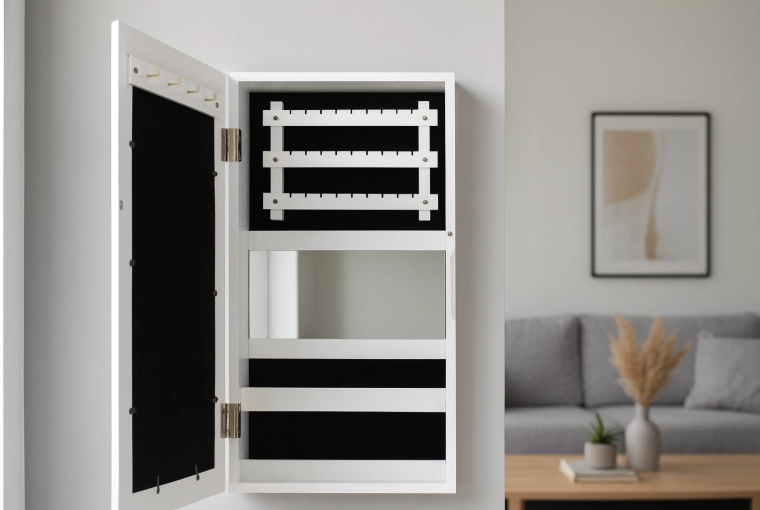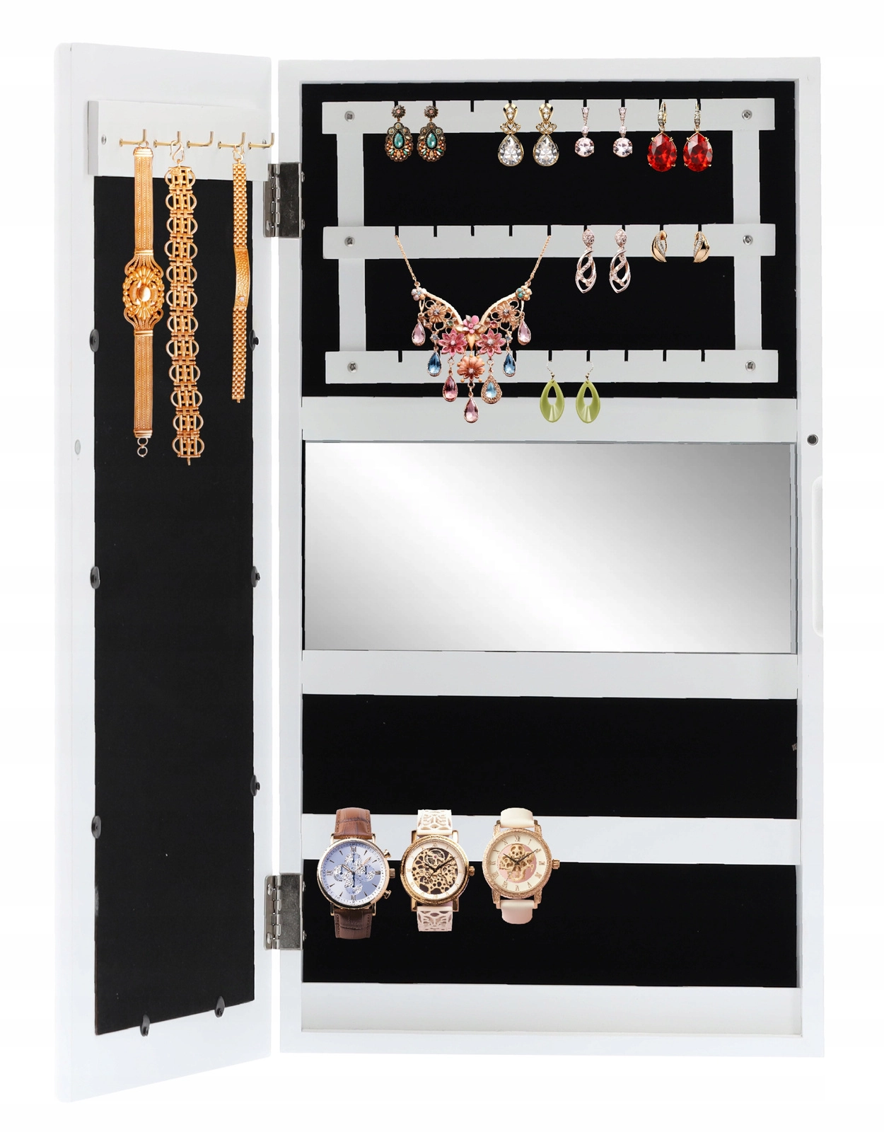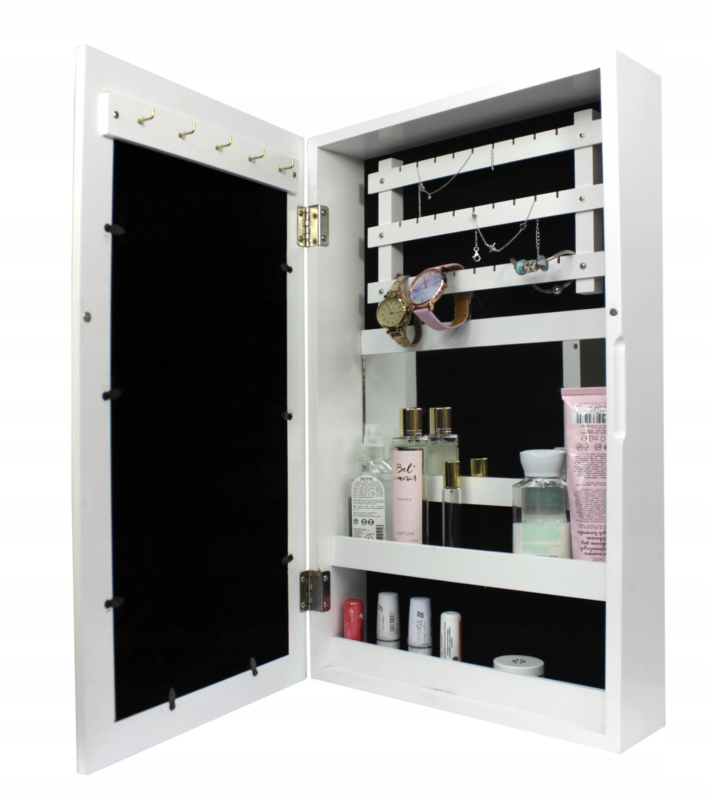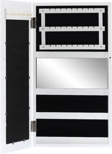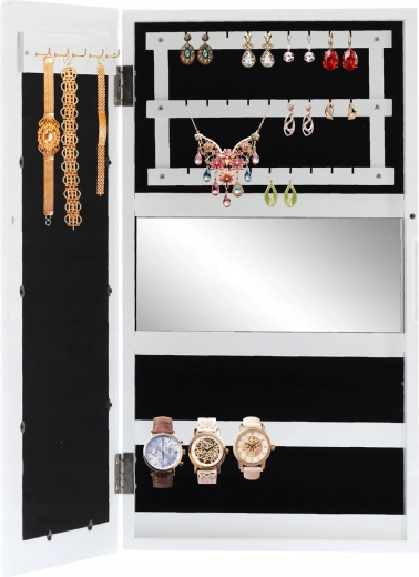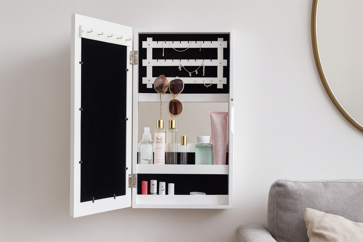 Spejlet på indersiden af døren gør det nemt at matche smykker med outfittet uden at skulle gå hen til et stort spejl.