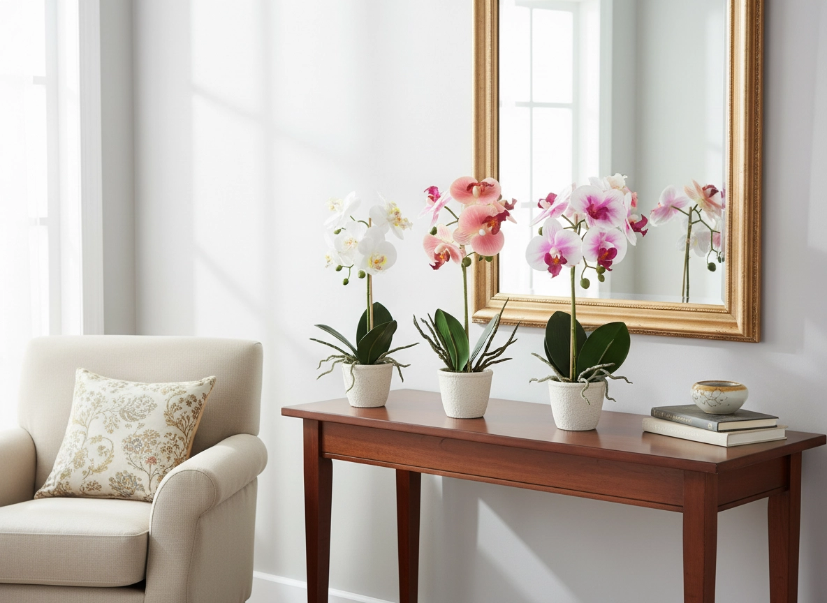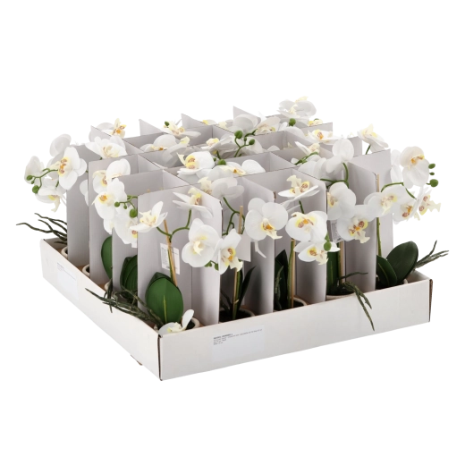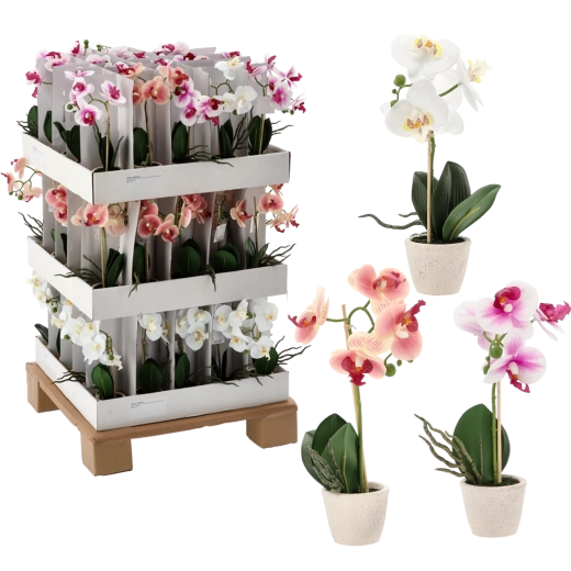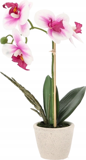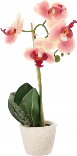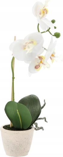 Elegant kunstig orkidé i urtepotte giver dit interiør friskhed og stil uden krav til pleje. Takket være realistiske blomster og blade ser den levende ud, er vedligeholdelsesfri og klar til straks at blive placeret på bord, hylde eller vindueskarm. Ideel til hjem, kontor og reception.
