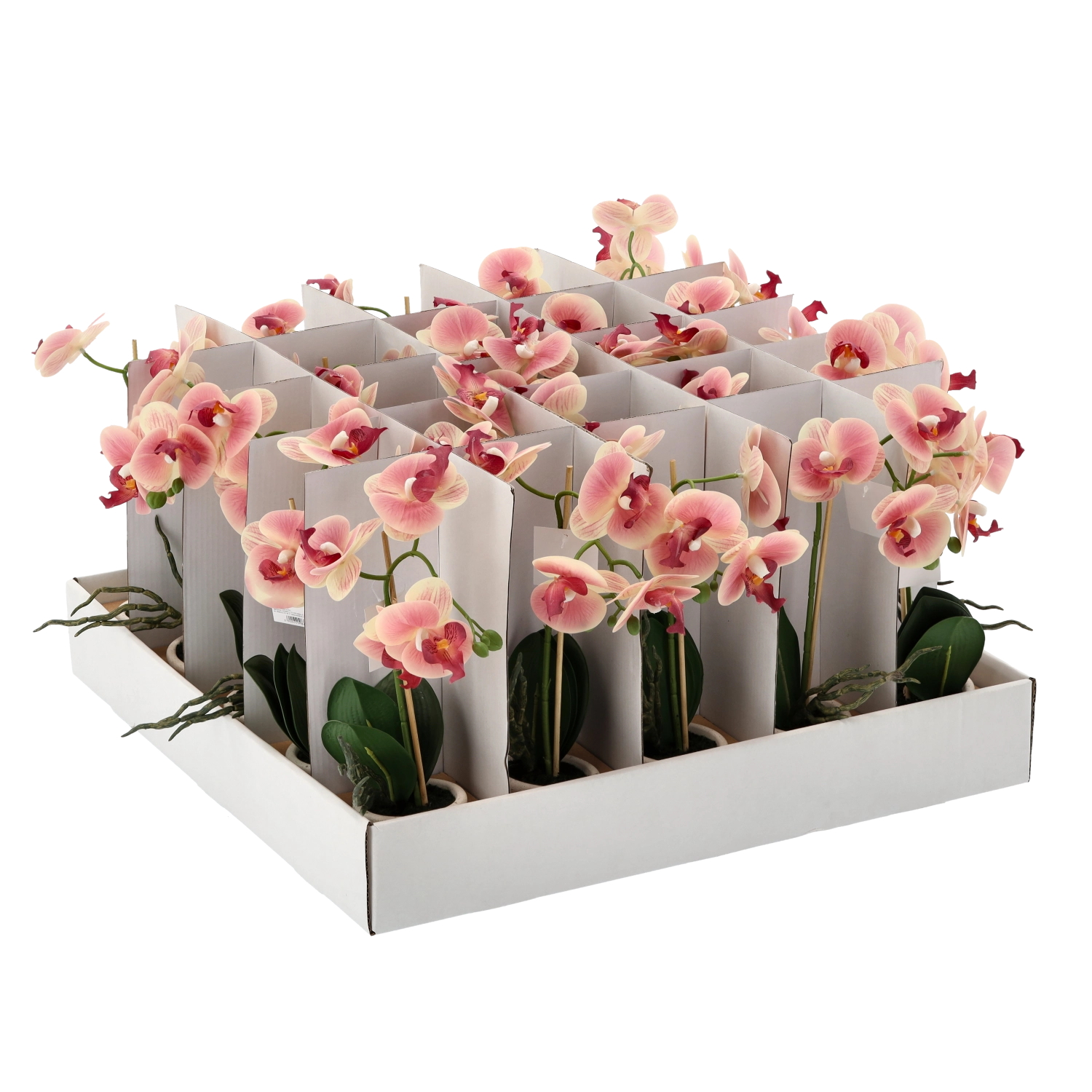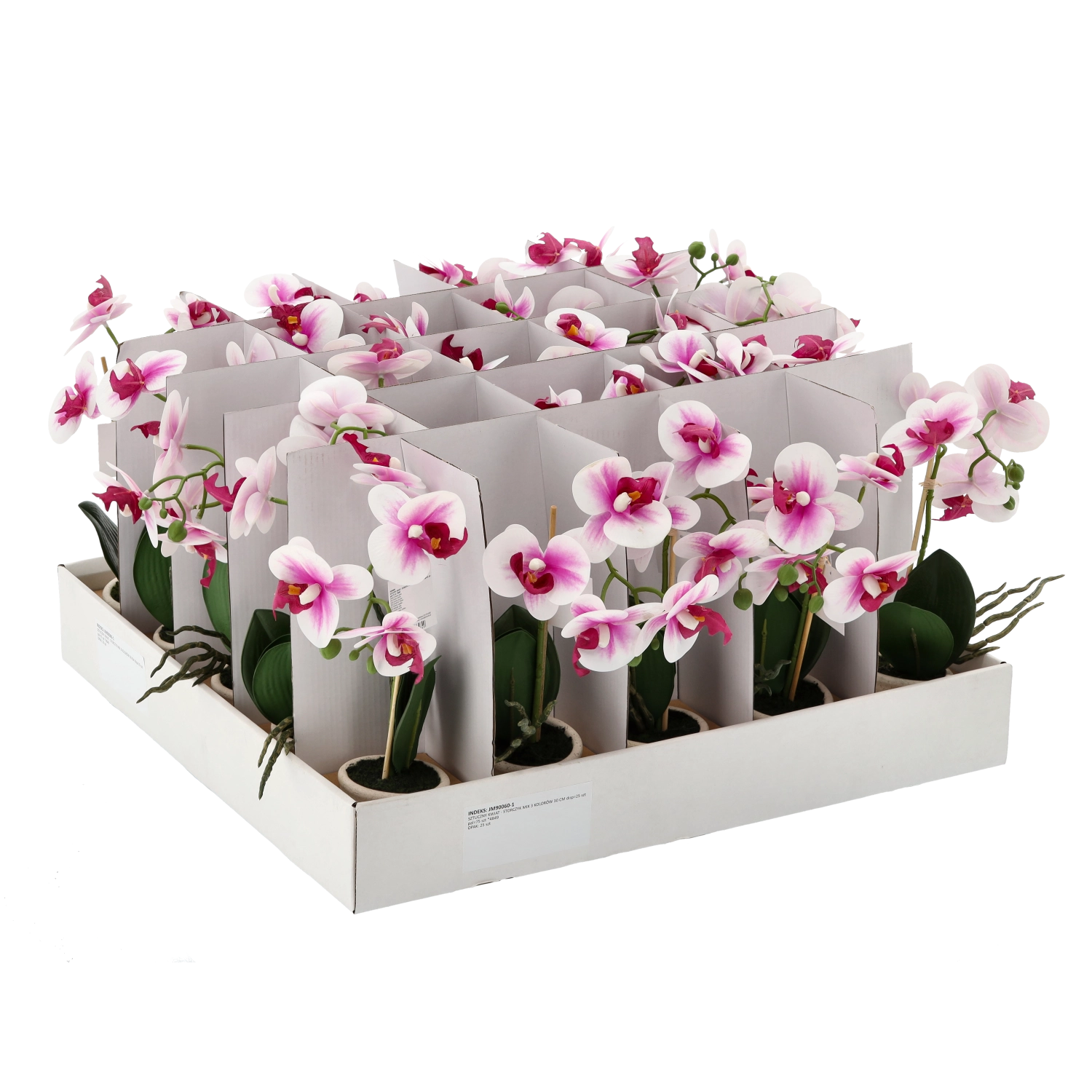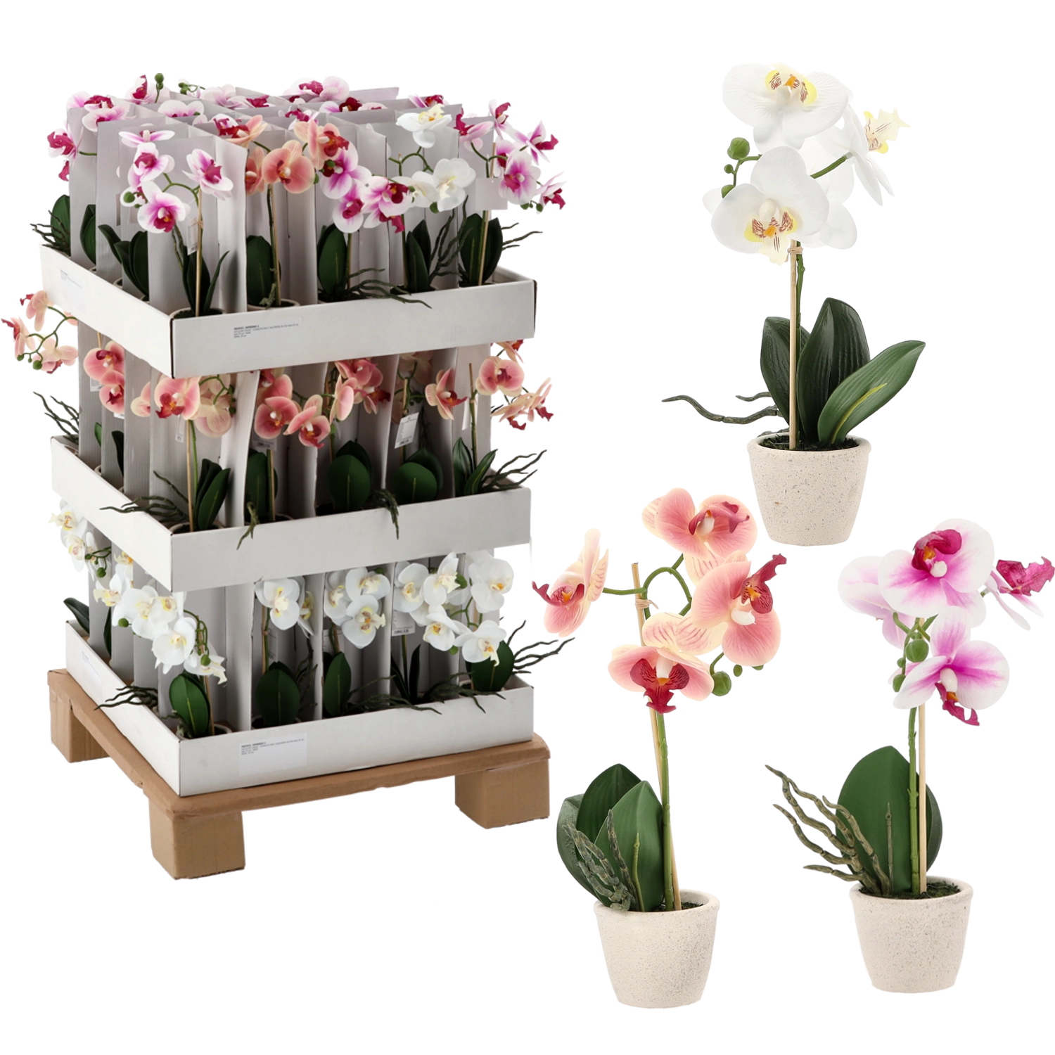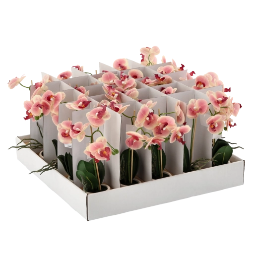 Hver enkelt er placeret i en dekorativ urtepotte og fås i et mix af 3 farver – hvid, pink og lyserød. Blomster, blade og stilke er udført med fokus på detaljer for et maksimalt naturtro udseende.