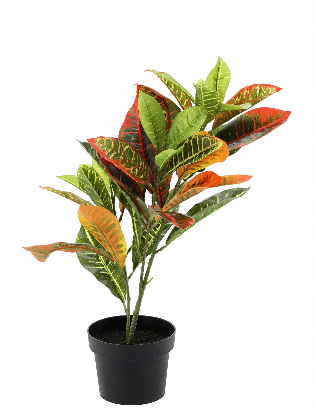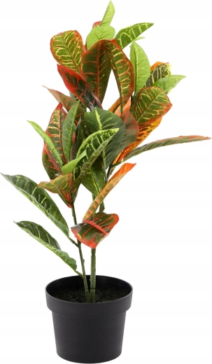 Den kunstige stueplante inspireret af kroton er et fremragende valg for alle, der vil opfriske indretningen med det samme uden bekymringer om pleje. Kombinationen af farverige blade og den kompakte sorte urtepotte skaber en dekoration, der gør sig bemærket både hjemme og i erhvervsmiljøer.