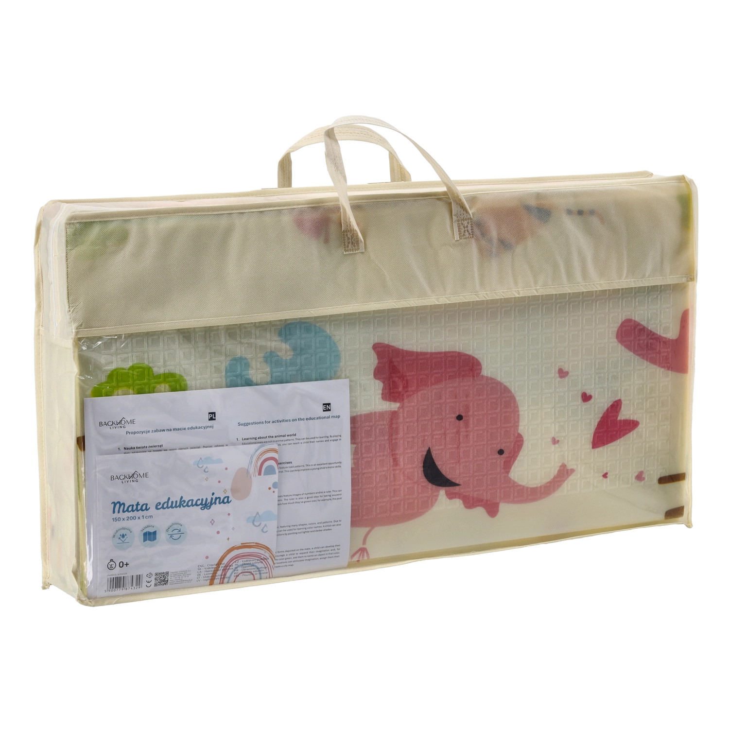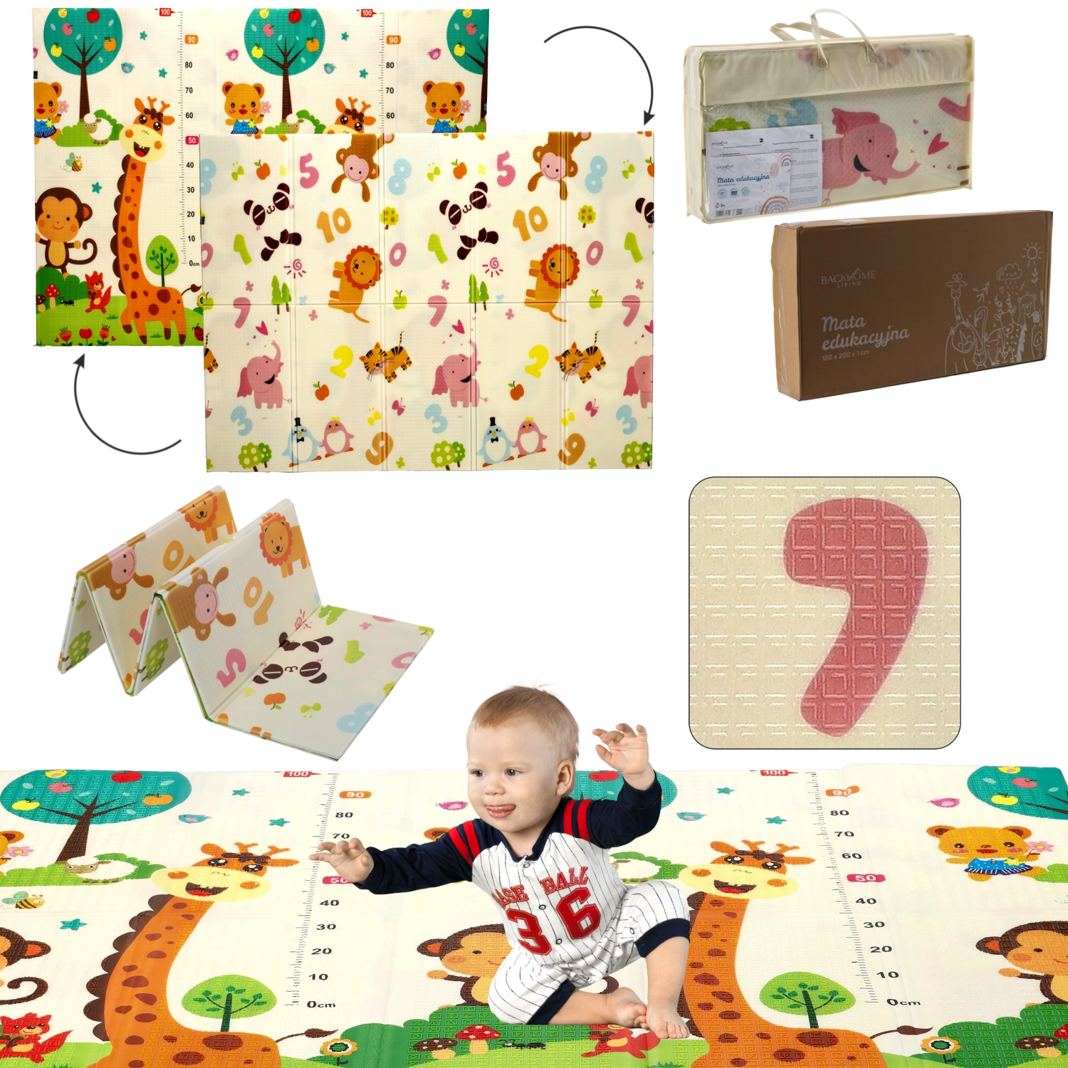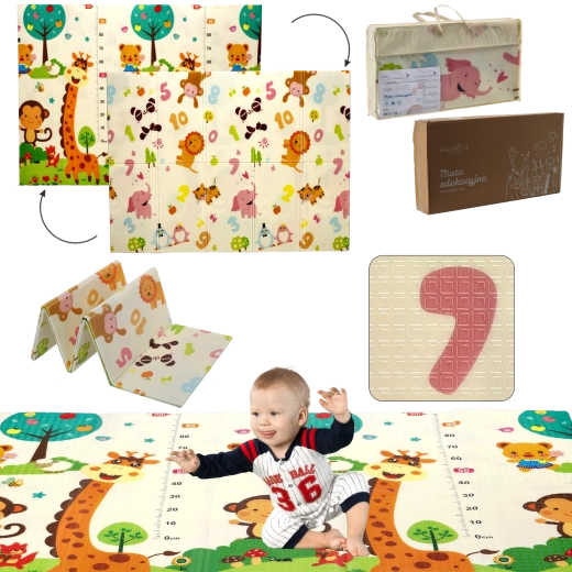 Denne dobbeltsidede læringsmåtte giver komfort og sikkerhed ved gulvleg. Den store størrelse 150×200×1 cm skaber et behageligt område til kravlen, de første skridt og fælles aktiviteter. Motiverne af dyr og tal understøtter visuel perception, udvider ordforrådet og fremmer læring gennem leg.