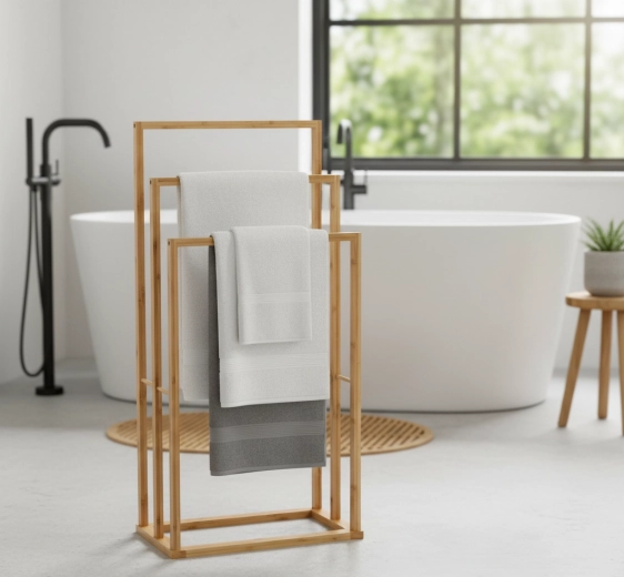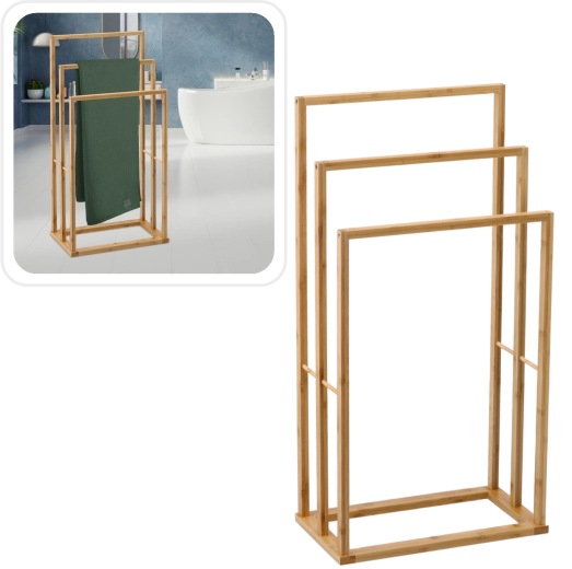 Opgrader organiseringen af dit badeværelse med et stilfuldt håndklædestativ i naturlig bambus. Tre højdegraduerede tværstænger giver rigelig plads til tørring og overskuelig opbevaring af håndklæder til hele familien. Det minimalistiske, luftige design fremmer luftcirkulation og fremskynder tørringen.