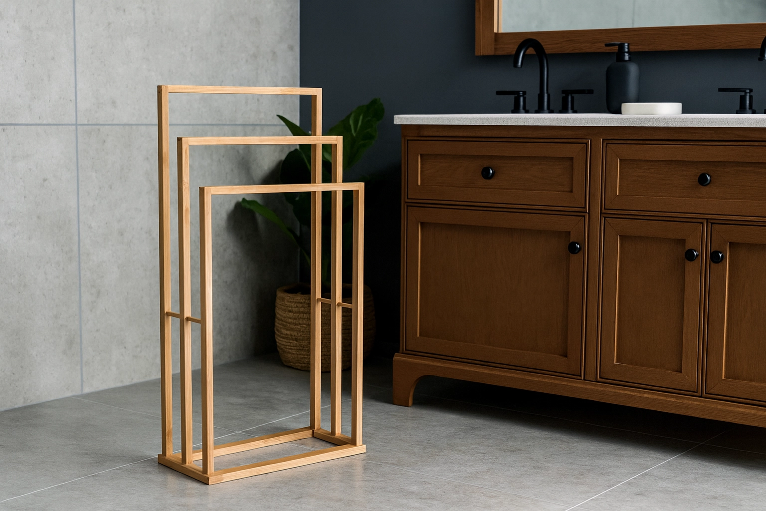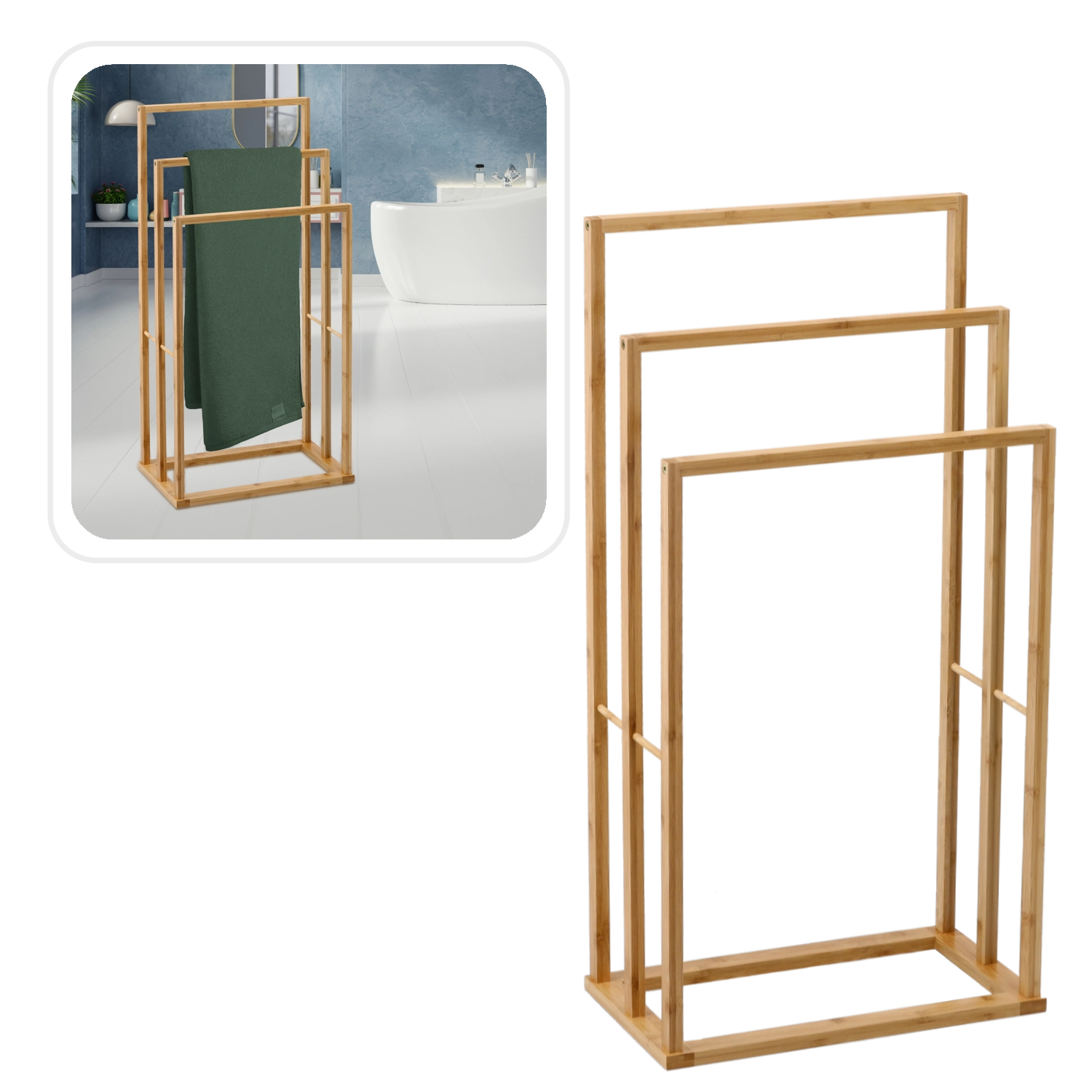 Takket være de kompakte mål på 42 × 24 × 82 cm passer stativet nemt ind selv i mindre badeværelser, mens den solide rektangulære base sikrer fremragende stabilitet. Bambus er holdbart, let og nemt at vedligeholde – tør blot af med en fugtig klud.