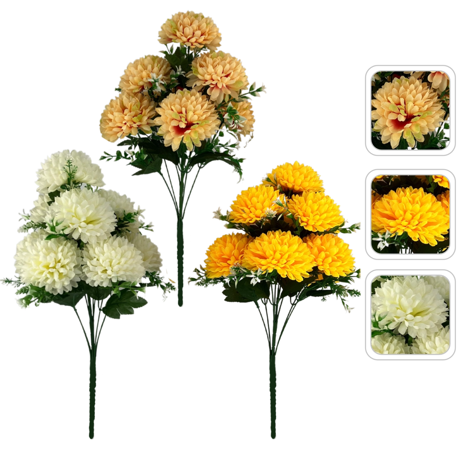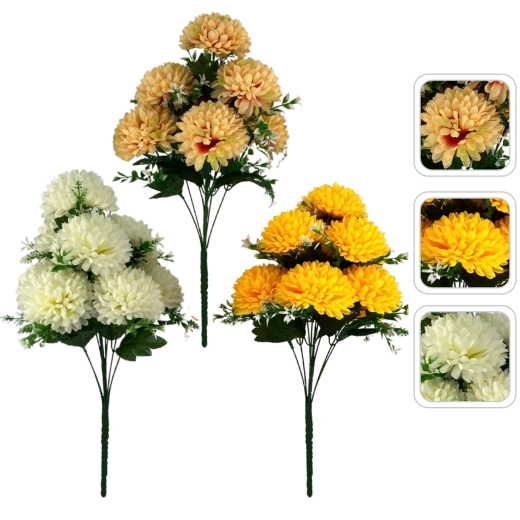 Denne kunstige krysantemumbuket er et ideelt valg til varig udsmykning af hjem, kontor og kommercielle rum. Takket være den realistiske udformning af blomster, blade og græsser virker den naturtro og bevarer sit friske udseende hele året uden vanding eller særlig pleje.