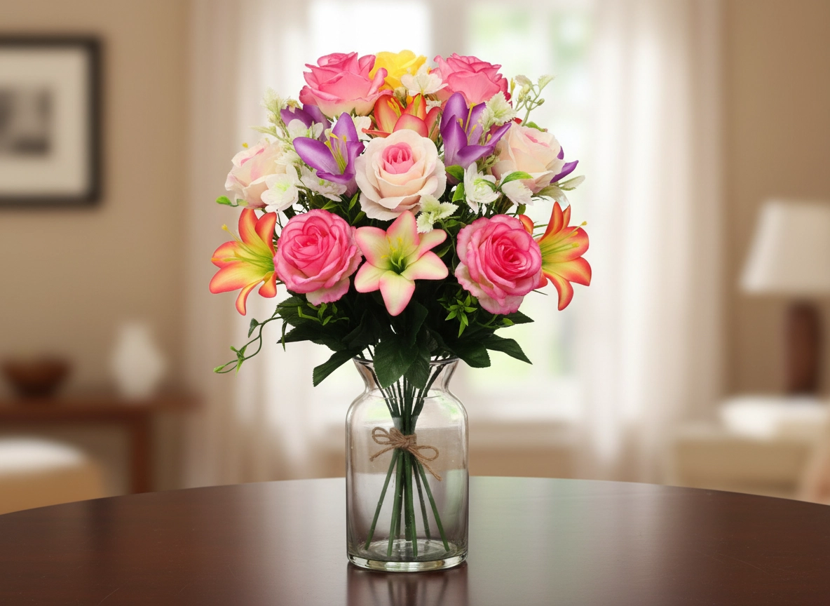 Blade og blomster efterligner troværdigt friske roser og liljer – buketten bevarer form og farver uden vanding og pleje.