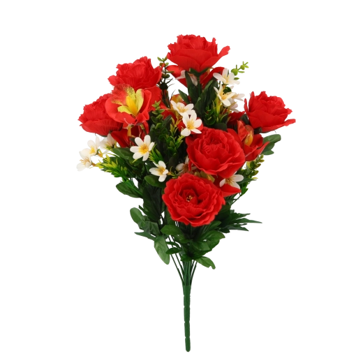 Elegant kunstig buket med en kombination af roser, orkidéer og små hvide blomster i et farvemiks (rød, lyserød, orange). Den byder på realistiske detaljer, lang holdbarhed uden vedligeholdelse og lyser straks op i både interiør og festlig udsmykning.