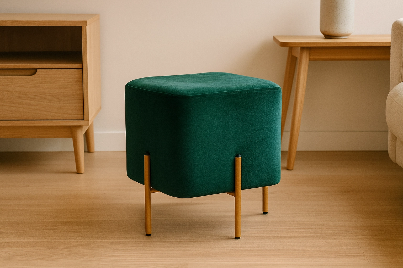 Elegant kvadratisk puf med blødt fløjlspolster og stabile metalben i guldfarve giver dit interiør både stil og funktion. Den byder på blødt og behageligt sæde, kompakte mål 35 × 35 × 40 cm og alsidig anvendelse som fodskammel, ekstra siddeplads eller lille sidebord. Stabil konstruktion og stilfulde gulddetaljer passer perfekt i stue, soveværelse og entré.