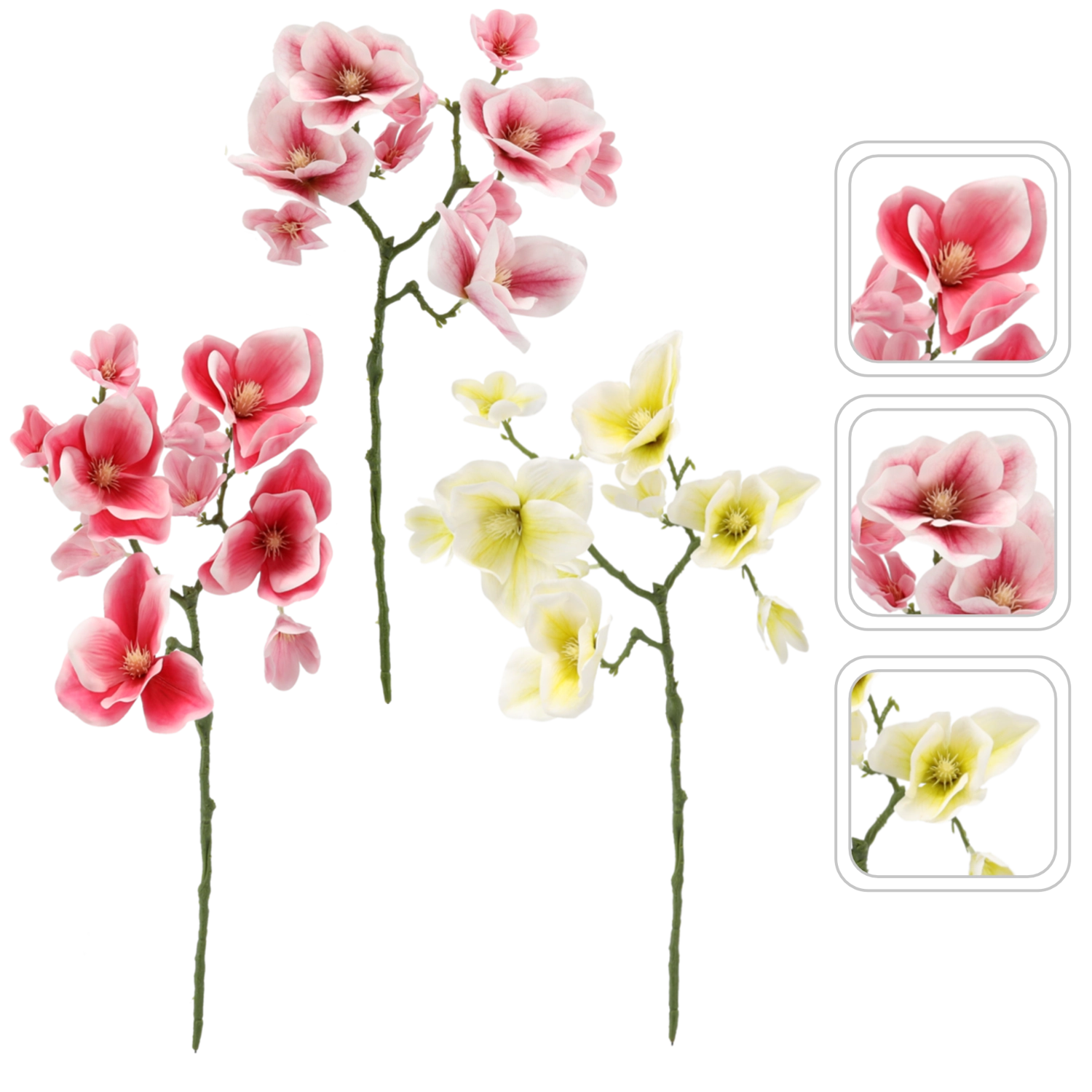 Dekorativ kunstig magnoliakvist med en højde på 56 cm, som giver dit interiør et strejf af elegance året rundt. Den naturtro udførelse af blomster og blade virker realistisk, kræver ingen vedligeholdelse og er ideel til vaser, arrangementer eller som tilbehør til bryllups- og sæsonpynt. Fås i et mix af farver for nemt at matche din stil.