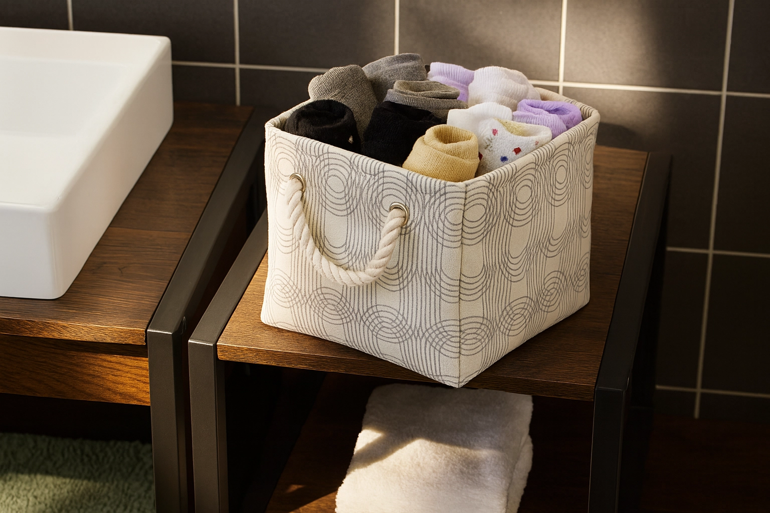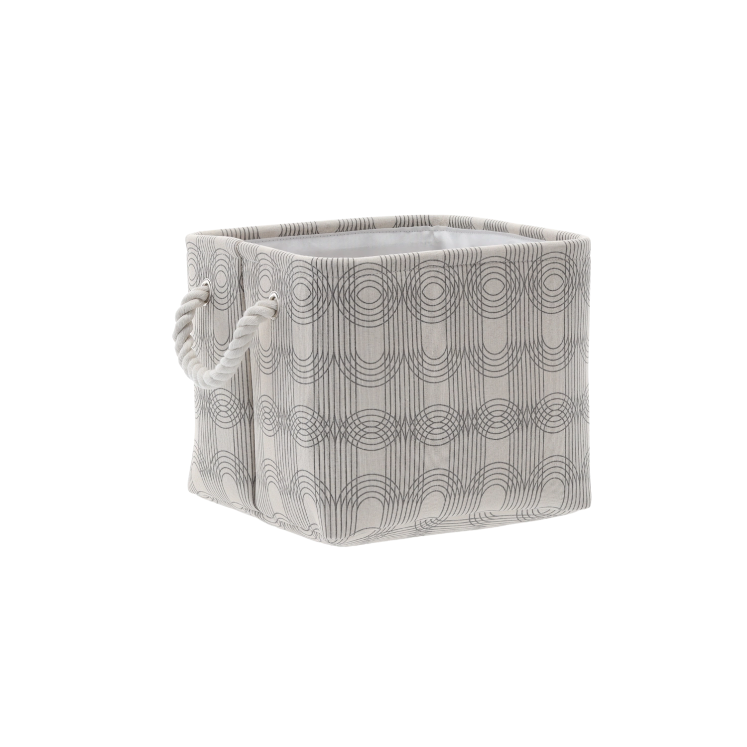 Neutrale beige‑grå nuancer og det fine geometriske mønster passer nemt til både moderne og skandinavisk stil. Kurven ser ren og velordnet ud på hylden, i badeværelset og på kontoret.