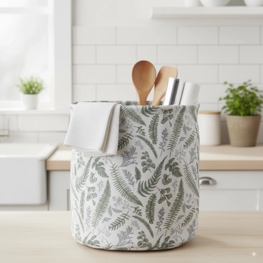 Kurven er sammenklappelig for pladsbesparende opbevaring uden for sæson, og de solide sidehåndtag gør håndteringen nem. Den neutrale farveskala med bladprint passer perfekt til skandinaviske, moderne og naturinspirerede interiører – fra soveværelse og vaskerum til børneværelse.