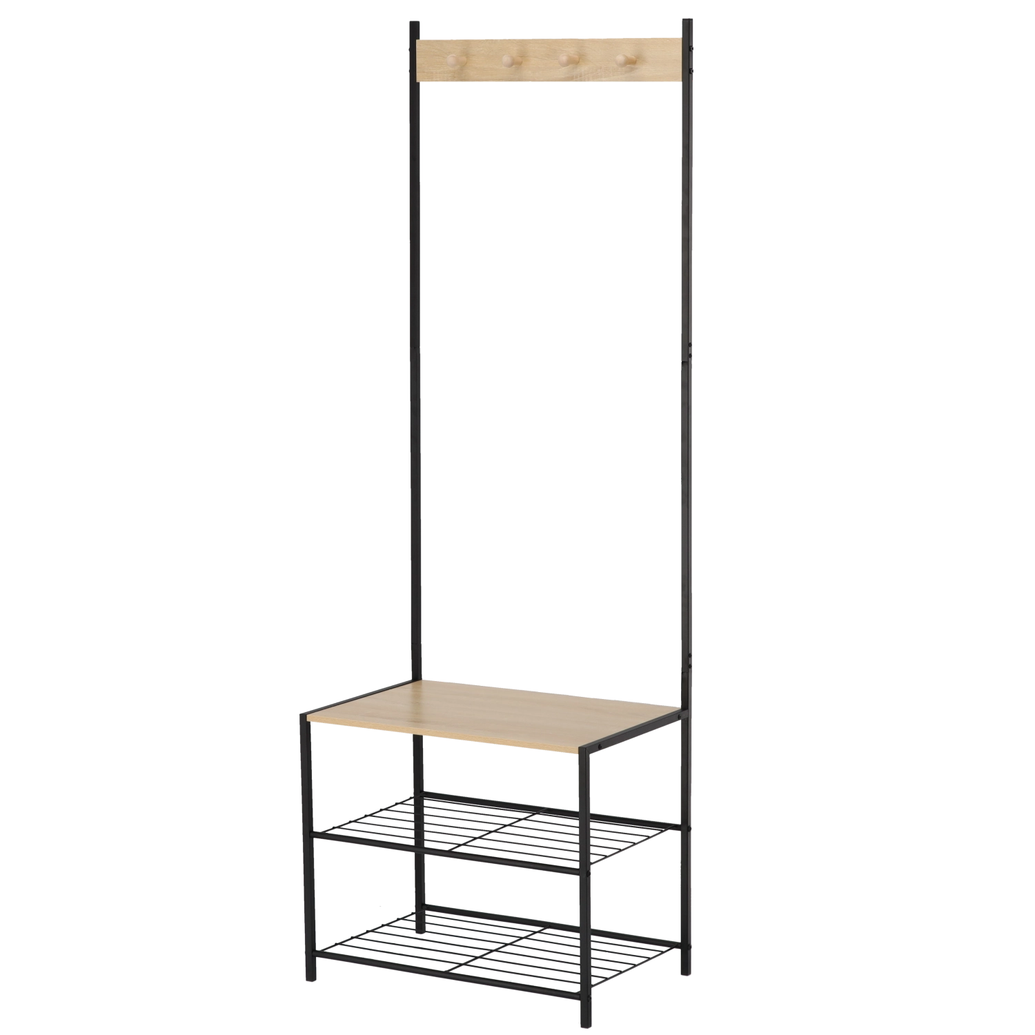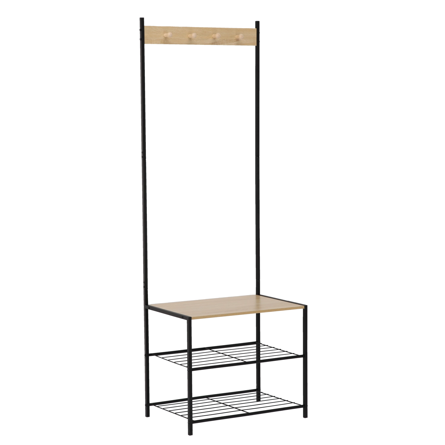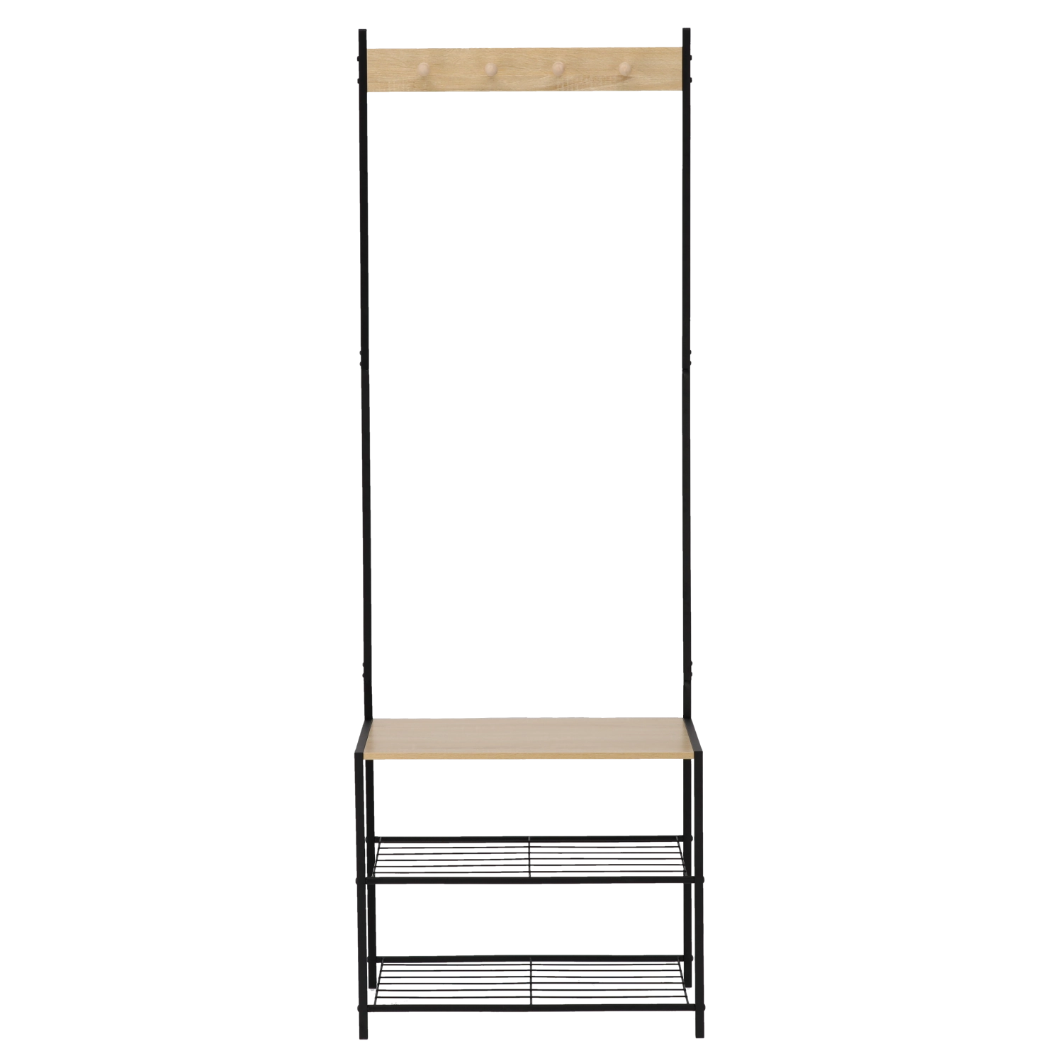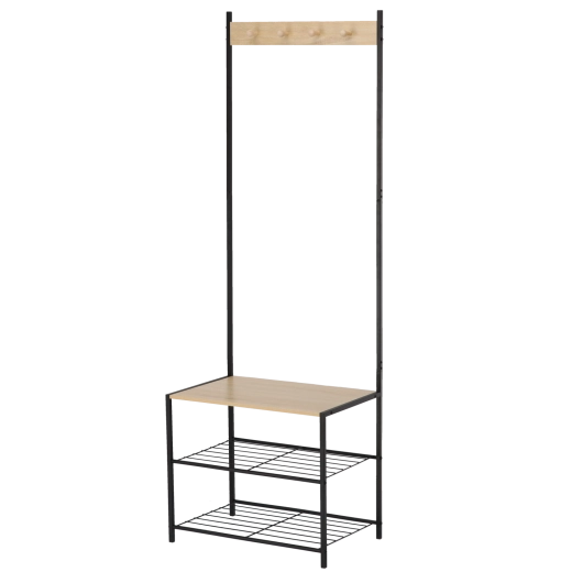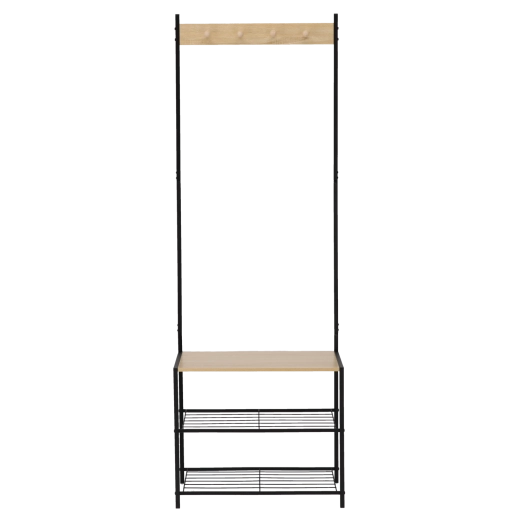 Den massive ramme af lakeret metal sikrer stabilitet og lang holdbarhed, mens træaccenter giver et varmt loft-look. De to nederste metalhylder rummer flere par sko, mens den øverste skinne med kroge holder jakker, tørklæder og håndtasker overskueligt samlet ét sted.