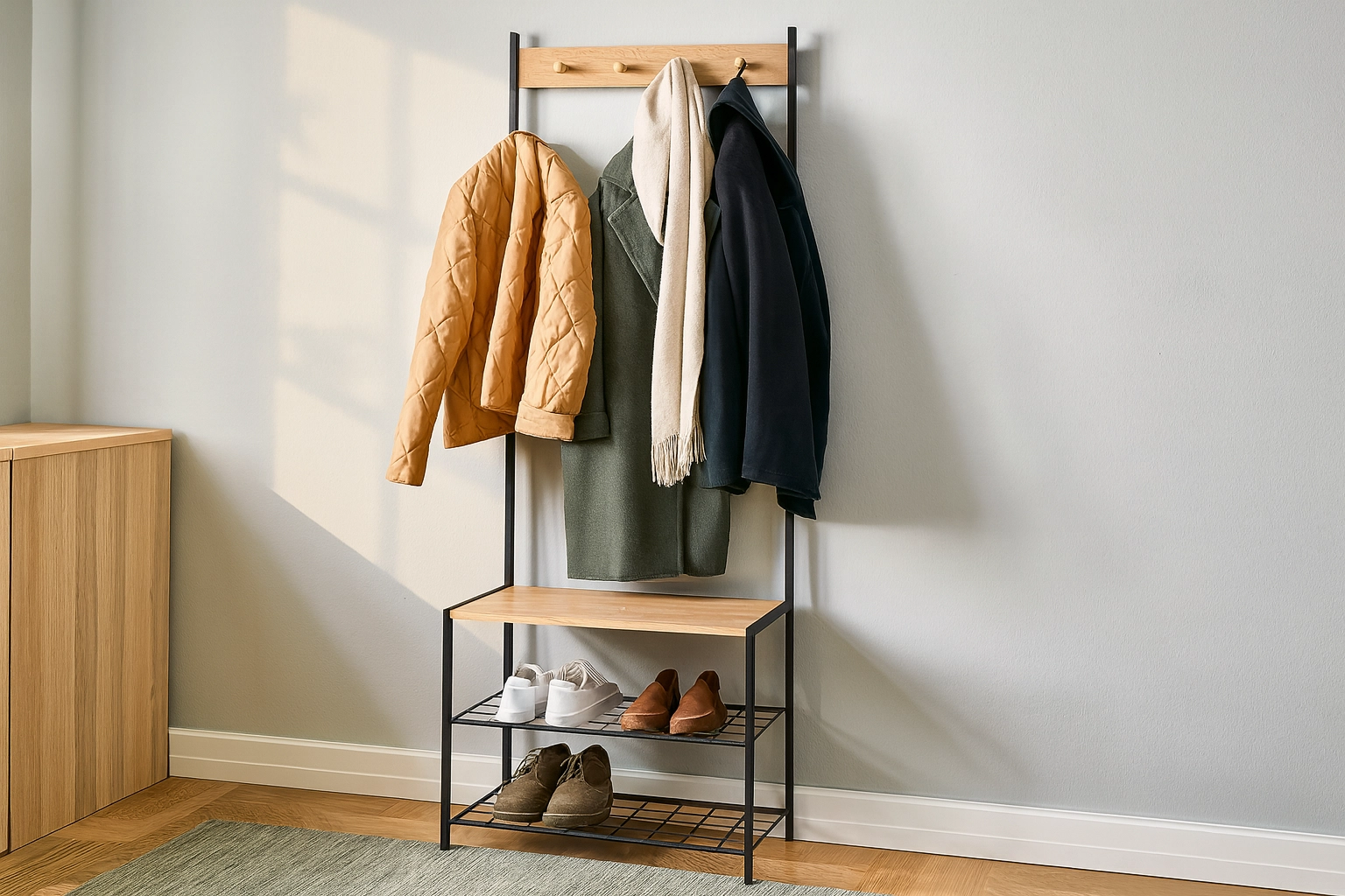 Den robuste stålramme med pulverlak tåler daglig brug og bærer frakker, fodtøj og tasker uden at vakle.