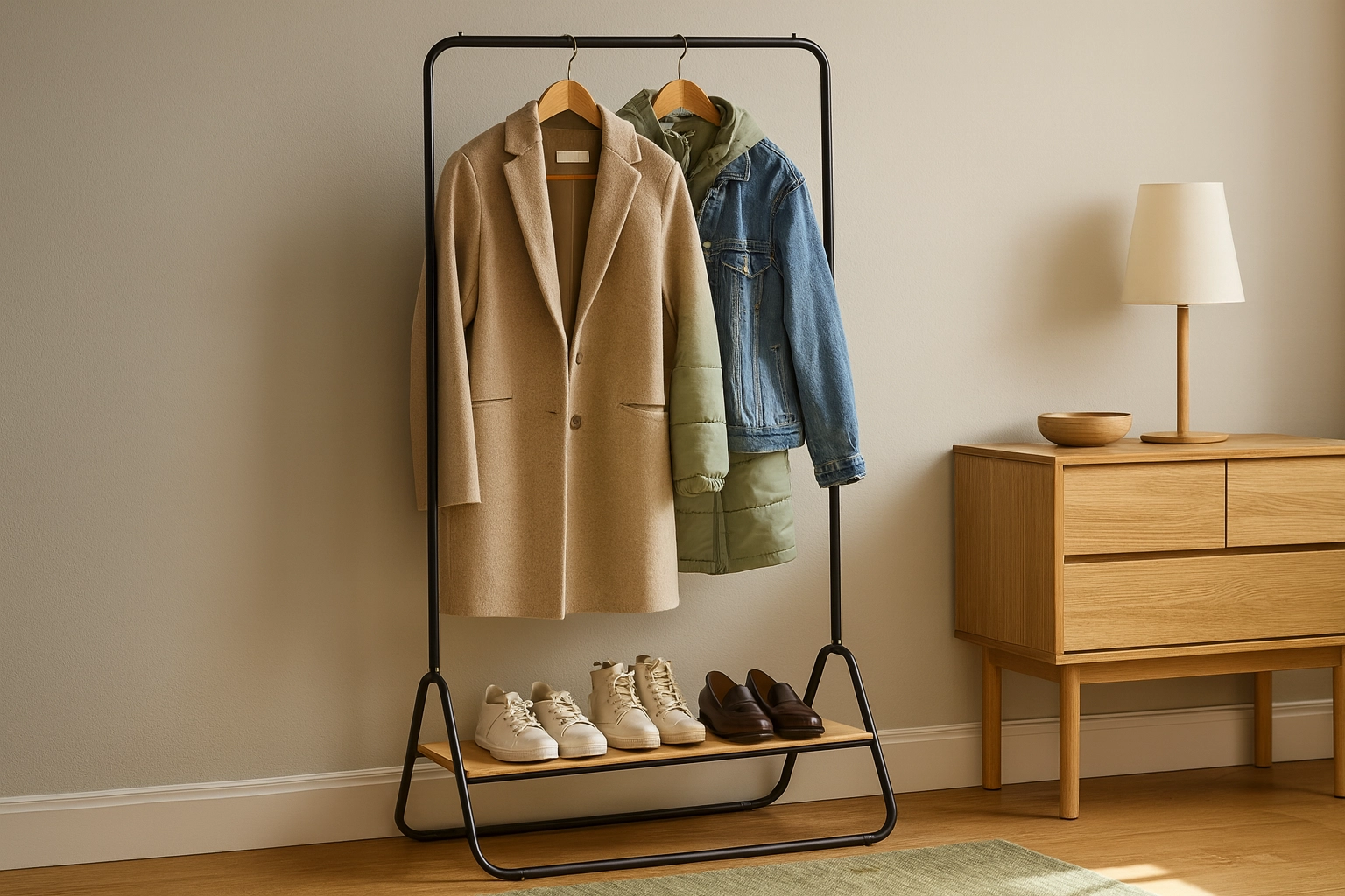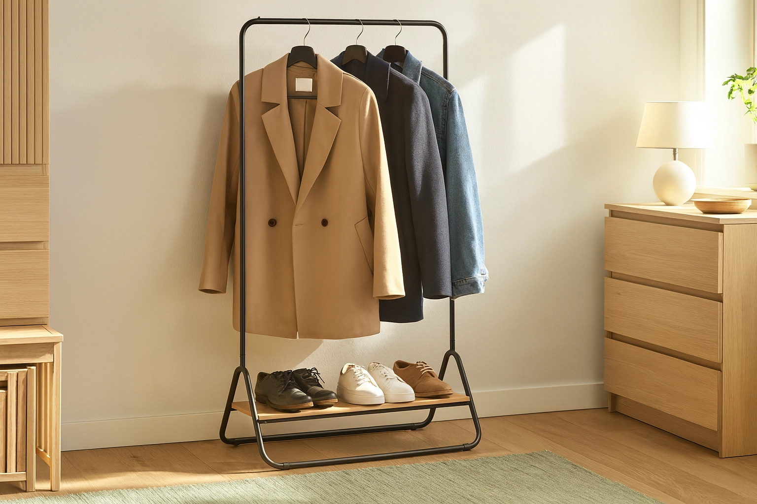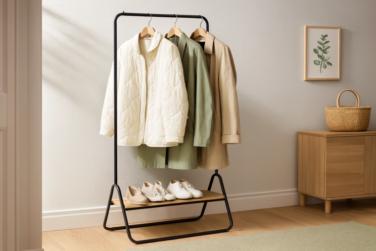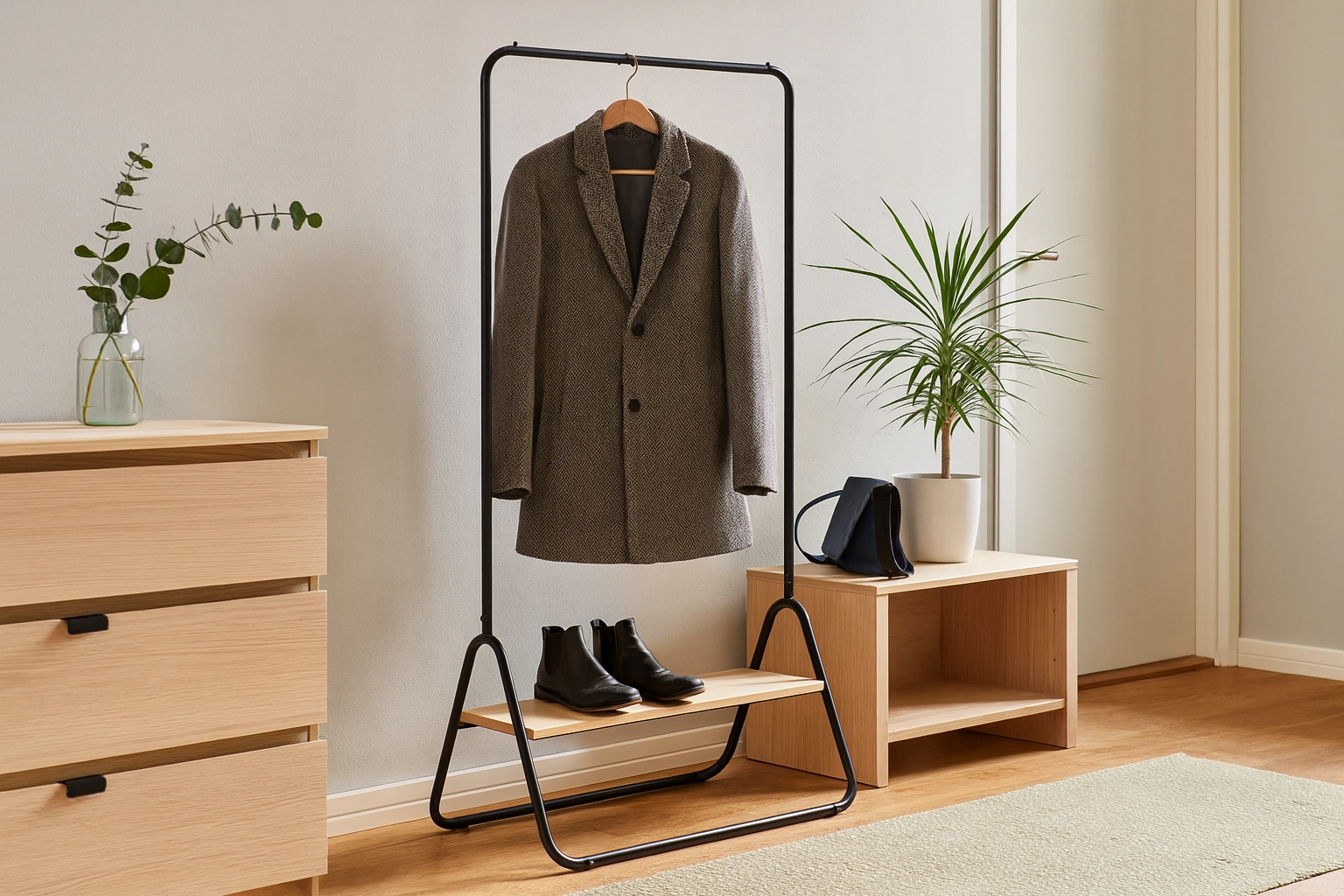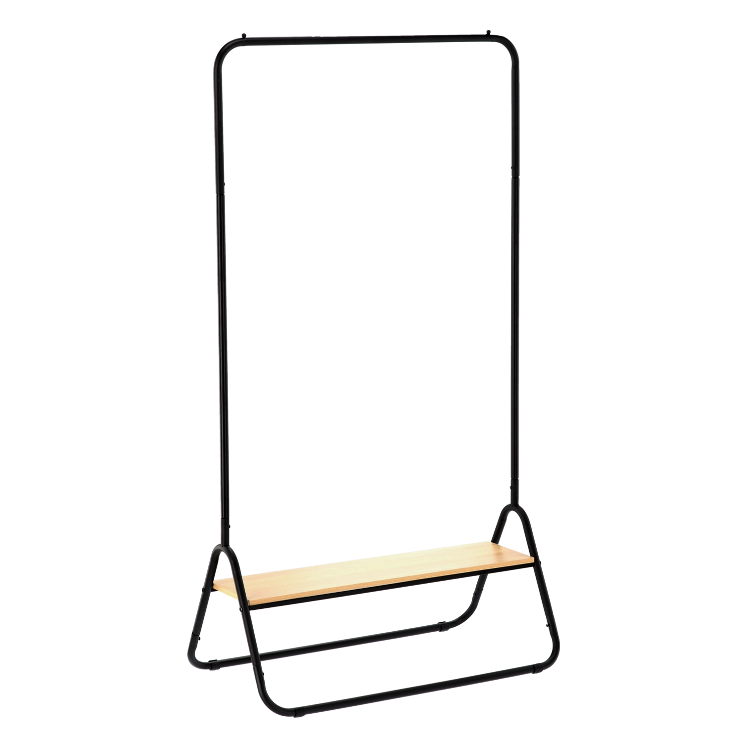 Bundhylden i MDF med en tykkelse på 12 mm er ideel til sko, tasker og opbevaringskurve, mens den øverste stang rummer hverdagstøj såvel som mere voluminøse frakker. Pulverlakeret finish øger modstanden mod ridser og korrosion, så stativet holder til langvarig brug.