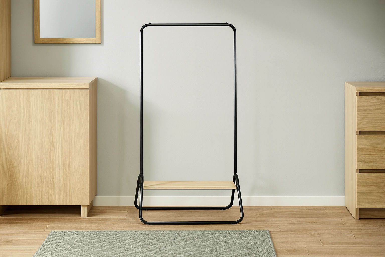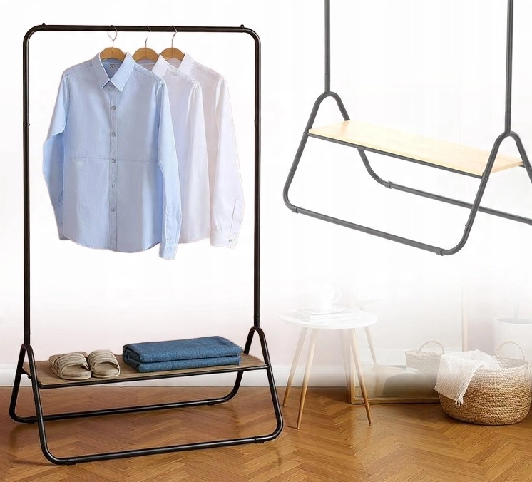 Hold orden med et minimalistisk tøjstativ, der forener funktionalitet og et moderne udtryk. Sort metal kombineret med trædekor passer ind i enhver indretning – fra moderne til klassisk. Takket være den fritstående konstruktion kan du nemt placere det, hvor du har brug for det.